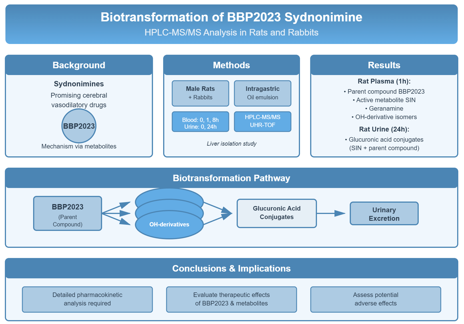 Materials and Methods: Identification of BBP2023 biotransformation products was performed in male rats and male rabbits after intragastric administration of BBP2023 in form of oil emulsion. Blood samples were collected before and 1 and 8 hours after administration. Urine samples from rats were collected before and 24 hours after administration. Additionally, complete liver isolation was performed in another group of rats to investigate liver’s role in BBP2023 metabolism. Identification of products was performed using HPLC-MS/MS method as well as UHR-TOF method.