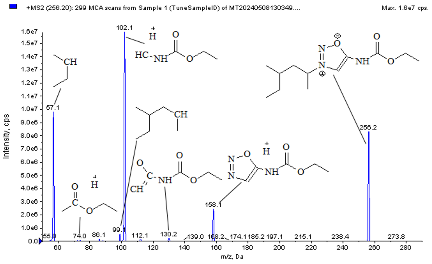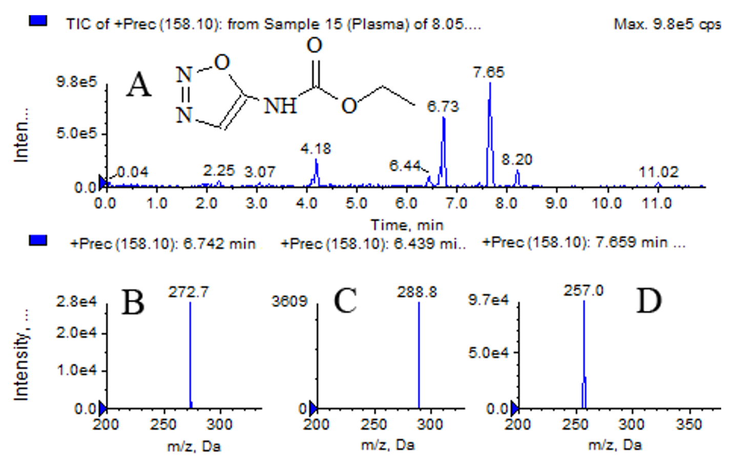 The study established that the product ion with m/z 158.1 Da is formed by BBP2023 metabolites generated through hydrocarbon radical oxidation (Fig. 5). The total ion chromatogram of precursor ions corresponds to the product ion chromatogram with m/z 102.1 Da.