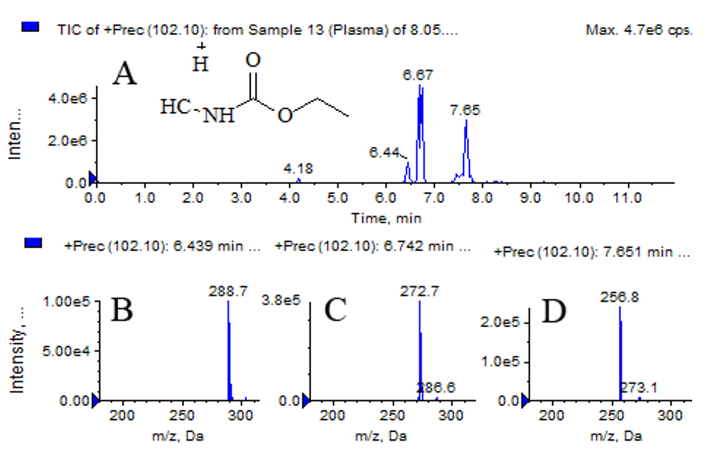 Chromatographic screening of rat plasma samples collected 1 hour after BBP2023 administration, performed in precursor ion detection mode for the product ion with m/z 102.1 Da, revealed several distinct peaks. Mass spectrometric analysis of these signals demonstrated that peaks with retention times (RT) of 6.44, 6.67, and 6.74 minutes (Fig. 3) likely correspond to oxidation products of BBP2023 at the hydrocarbon radical (di- and monohydroxy derivatives).