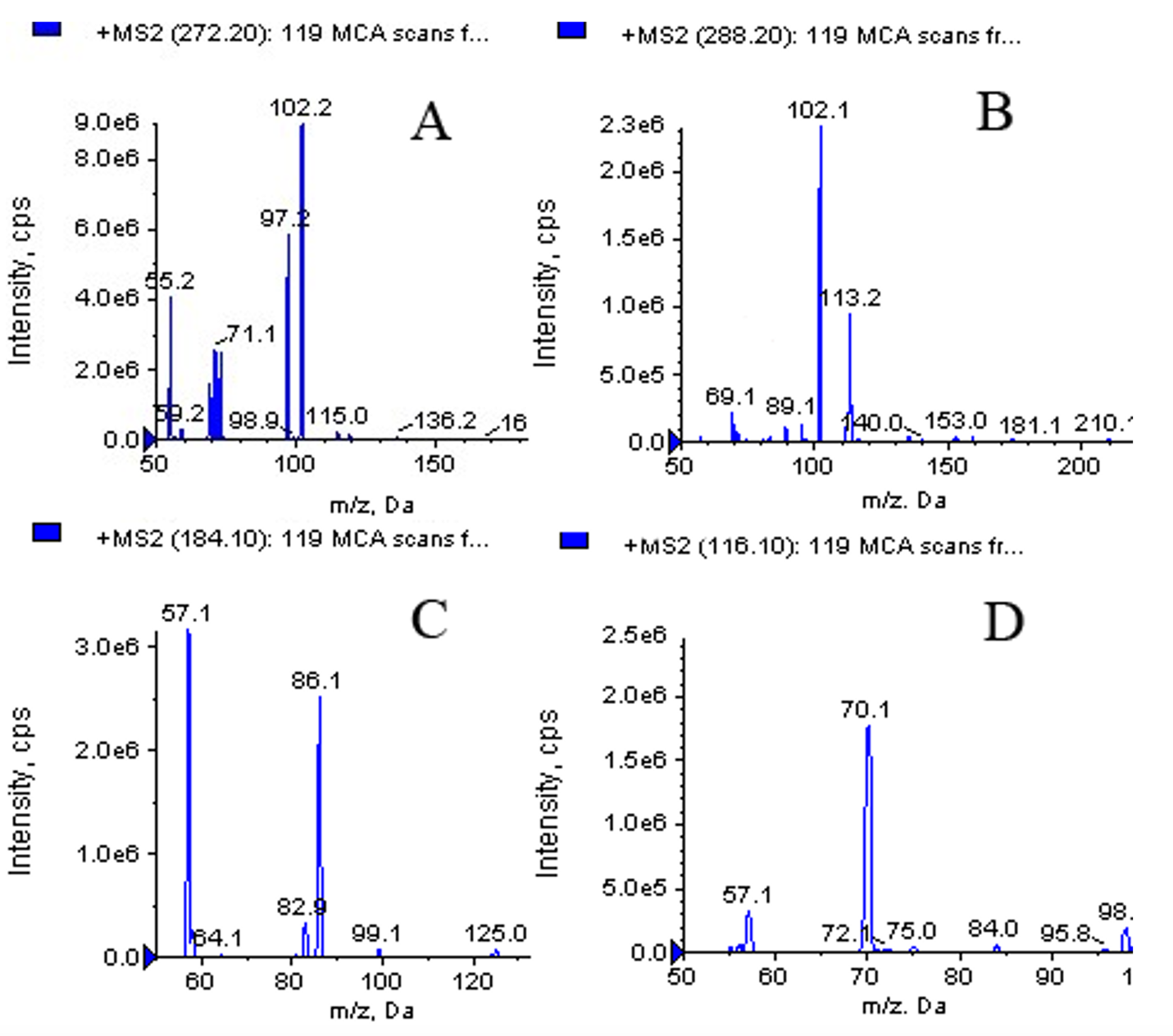 Note: DP – declustering potential; CEP – collision cell entrance potential; CE – collision energy; CXP – collision cell exit potential.
