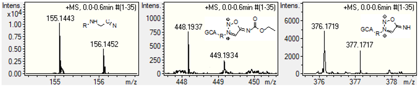 According to additional screening of potential BBP2023 metabolites based on theoretically calculated monoisotopic molecular masses, conjugates of the parent compound and its SIN metabolite with glucuronic acid were detected in the urine of experimental rats (m/z 448.1931 Da and 376.1719 Da, respectively). Additionally, a metabolite formed after nitric oxide elimination from SIN was identified in blood plasma (m/z 155.1469 Da). The ultra-high resolution mass spectra of molecular ions of the detected metabolites are presented in Figure 9.