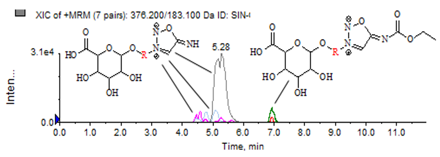 Results and Discussion: Analysis of rat plasma samples collected 1 hour after administration revealed the presence of parent compound, active metabolite SIN, geranamine and various isomers of OH-derivatives. Analysis of rat urine samples collected 24 hours after administration showed the presence of glucuronic acid conjugates of SIN and parent compound. Similar results were obtained from rabbit plasma samples, although with less variety of hydroxylated derivative isomers.