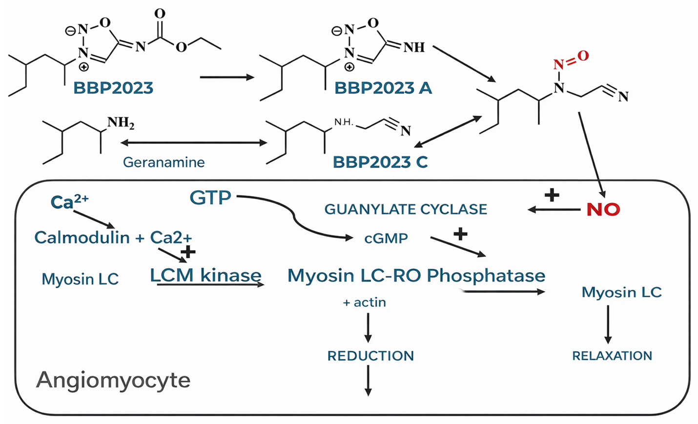 Figure 12. Structures of BBP2023, its metabolites, and the most probable mechanism of BBP2023 vasodilatory activity.