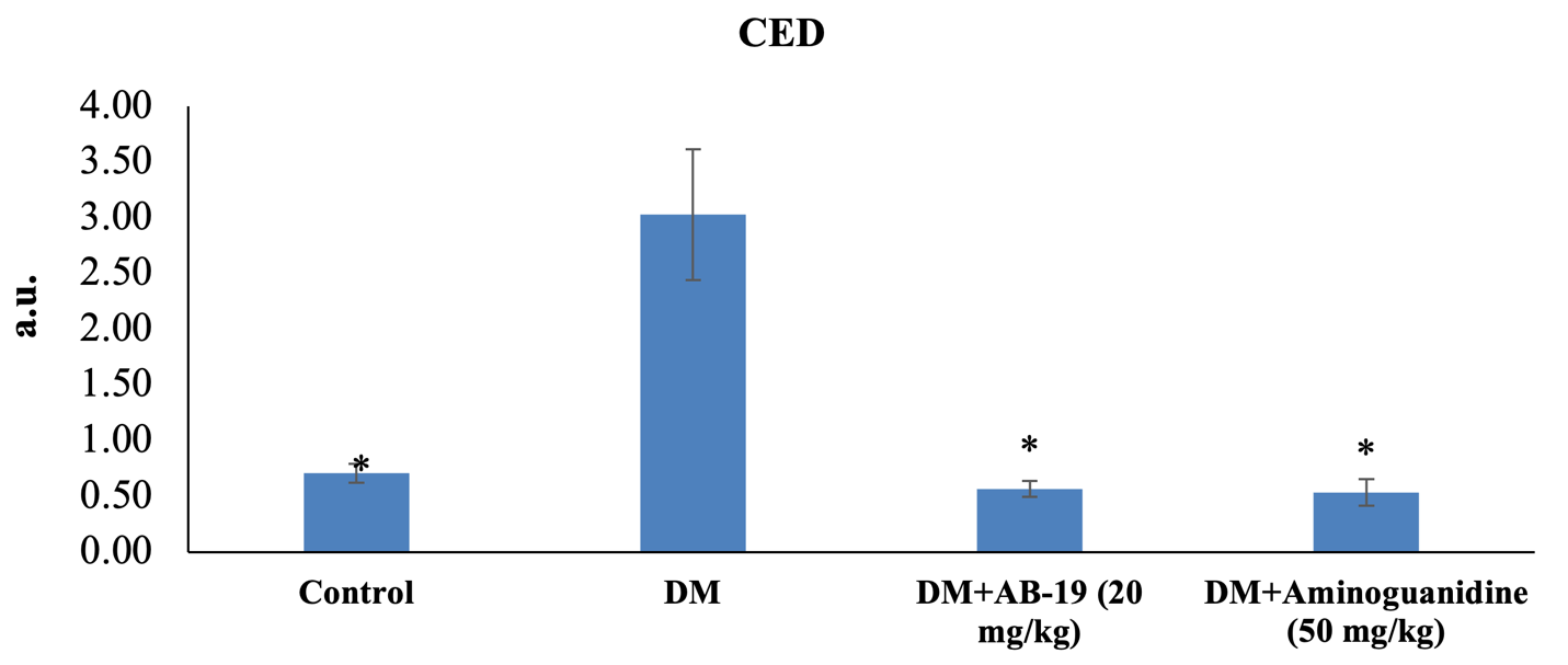 Figure 1. Endotheliotropic activity of AB-19 following a course of intragastric administration to animals with 3-month experimental DM. Note: CED – endothelial dysfunction coefficient; DM – diabetes mellitus; a.u. – arbitrary units; * – statistically significant vs. control (p<0.05, Kruskal-Wallis non-parametric test with Dunn’s post hoc test).