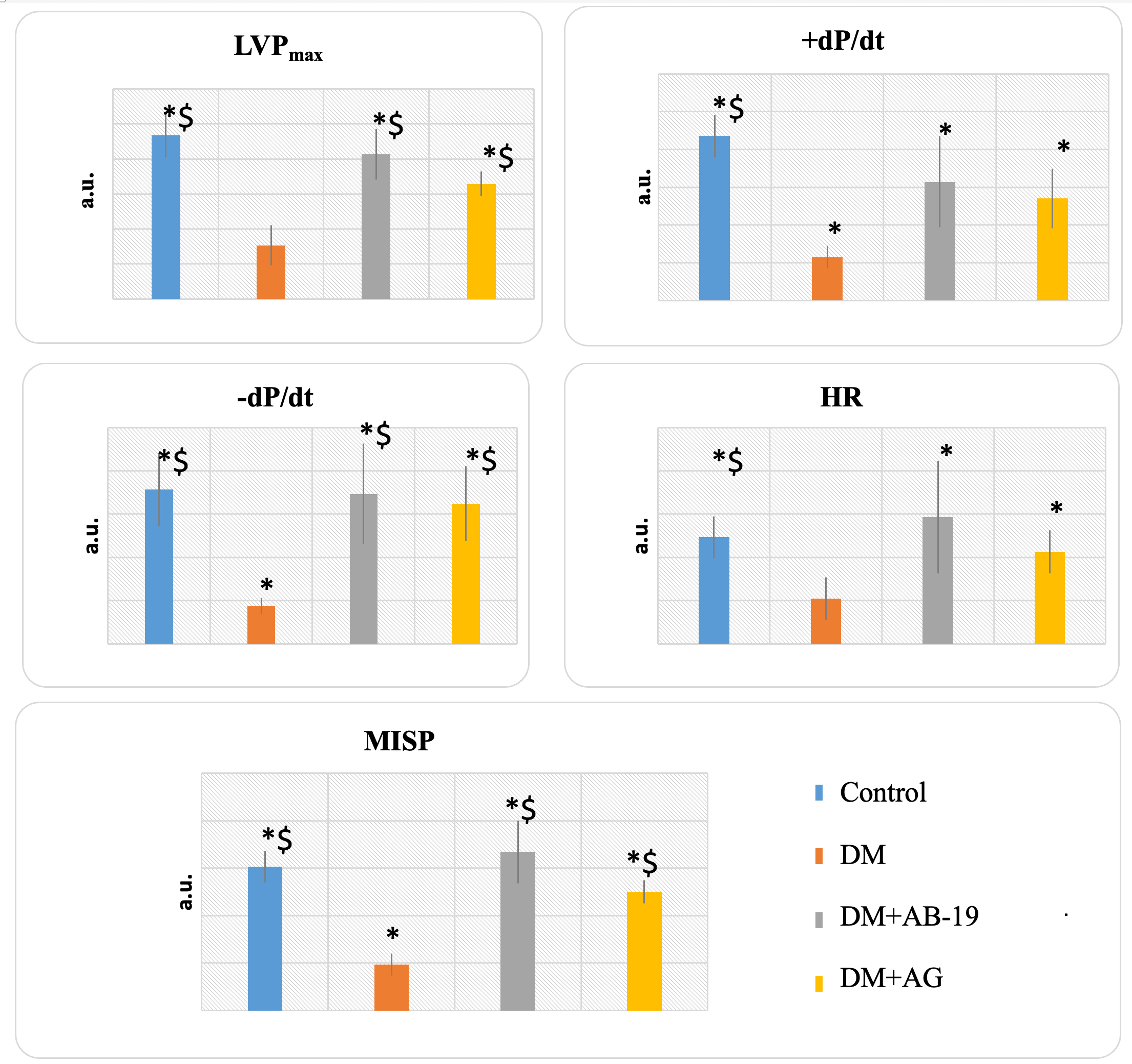 Figure 2. Effect of intragastric administration of compound AB-19 (20 mg/kg) or aminoguanidine (AG, 50 mg/kg) on cardiac dynamics parameters under conditions of increased afterload in animals with 3-month diabetes mellitus (area under the pharmacodynamic load curve, a.u.). Note: LVPmax – maximal left ventricular pressure; +dP/dt – myocardial contractility rate; -dP/dt – myocardial relaxation rate; HR – heart rate; MISP – maximum intensity of structural performance; a.u. – arbitrary units; DM – diabetes mellitus; * – statistically significant vs. baseline values (p<0.05, Wilcoxon paired non-parametric test); $ – statistically significant vs. diabetic animals (p<0.05, Kruskal-Wallis non-parametric test with Dunn's post hoc test).