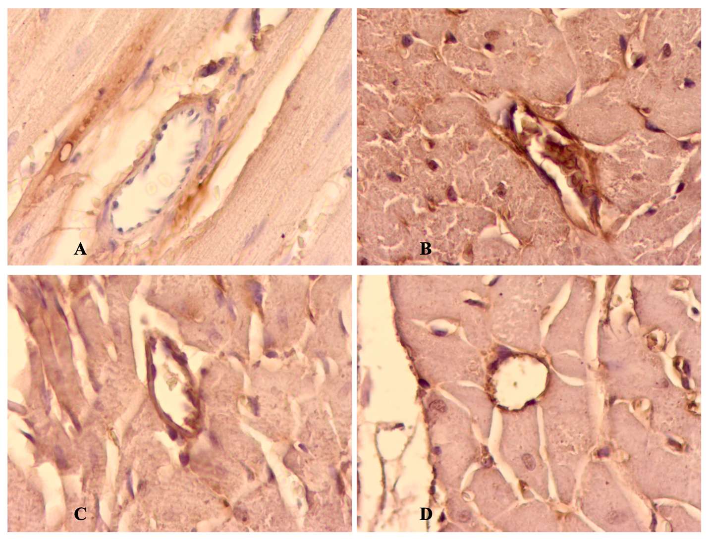 Figure 5. Immunohistochemical study of the effect of aminoguanidine (50 mg/kg) and AB-19 (20 mg/kg) on histological changes in the left ventricular myocardium of rats 3 months after modeling experimental diabetes mellitus using antibodies to RAGE (Counterstaining with hematoxylin; magnification ×400). Note: A – Intact control; B – DM control; C – DM + aminoguanidine 50 mg/kg; D – DM + AB-19 20 mg/kg.