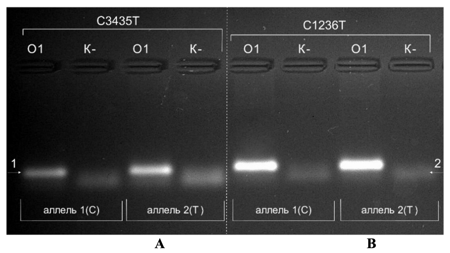 Figure 1. Example of interpretation of results for determining C3435T (A) and C1236T (B) polymorphisms of the MDR1 gene by AS-PCR with electrophoretic detection. Note: O1 – PCR product of the clinical sample; K- – negative control. The position of specific bands of target amplicons is indicated by arrow 1, the position of primer dimers is indicated by arrow 2.
