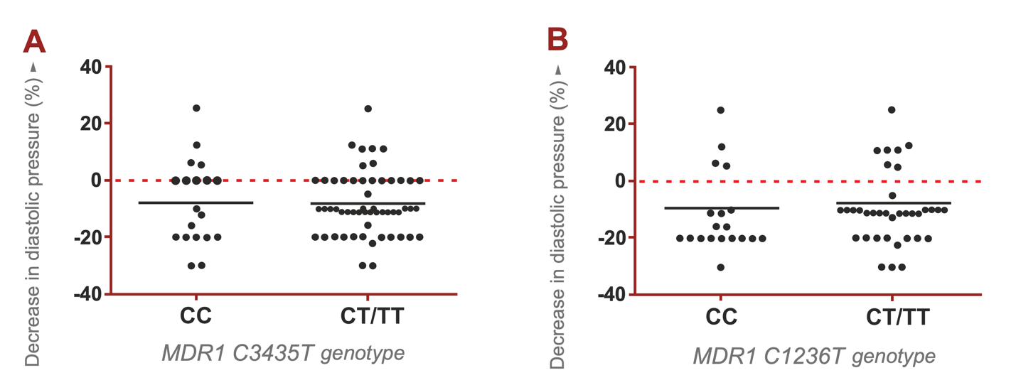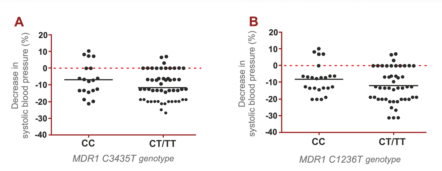 C3435T: patients with CT/TT genotypes (n=20) demonstrated significantly greater SBP reduction (11.8% ± 9.7) compared to carriers of the CC genotype (”wild” type) (n=14; 6.7% ± 9.6; p=0.03). Differences in DBP reduction between these groups did not reach statistical significance (8.2% ± 11.1 vs. 7.8% ± 14.9; p=0.45).