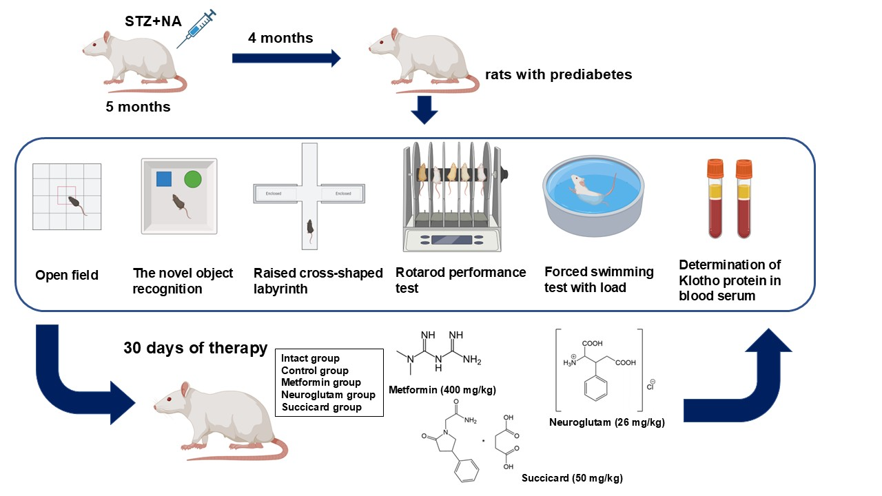 After establishing the diabetes model and selecting animals according to the impaired glucose tolerance criteria, the rats were randomly allocated into six experimental groups (n=10 each, 5 males and 5 females): 1) Intact group (healthy animals receiving purified water); 2) diabetes control group (diabetic animals receiving purified water); 3-5) diabetes groups receiving a 4-week therapy with metformin (400 mg/kg), neuroglutam (26 mg/kg), or succicard (50 mg/kg), respectively. All animals underwent a comprehensive assessment before the start of treatment and after its completion: OGTT, psycho-neurological status testing (open field, elevated cross maze, novel object recognition test (NOR)), assessment of physical performance and coordination (forced swimming with a load, rotarod), and determination of serum Klotho protein concentration by enzyme-linked immunosorbent assay (ELISA). All investigated substances were dissolved in purified water and administered daily for 30 days intragastrically via a metal gavage tube, followed by an additional 2 weeks during sequential testing.