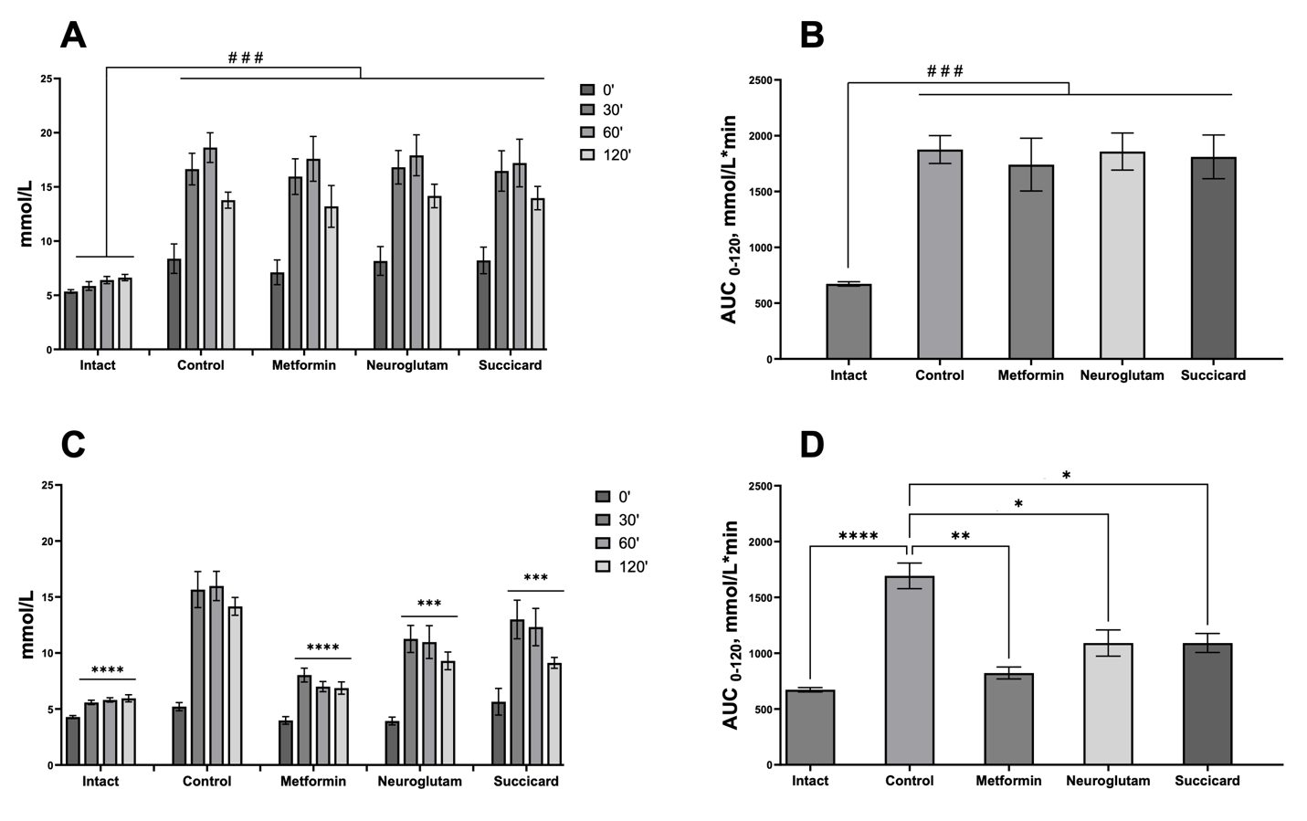 Figure 1. Results of the OGTT test before treatment (A); area under the curve “glucose level-time” before treatment (B); results of the OGTT test after treatment (C); area under the curve “glucose level-time” after treatment (D). Note: ### – p<0.001 compared to Intact group, * – p<0.05 compared to control group; ** – p<0.01 compared to control group; *** – p<0.001 compared to control group; **** – p<0.0001 compared to control group (Kruskal-Wallis rank analysis and the Dunn post-test); data shown as the mean ±SEM.