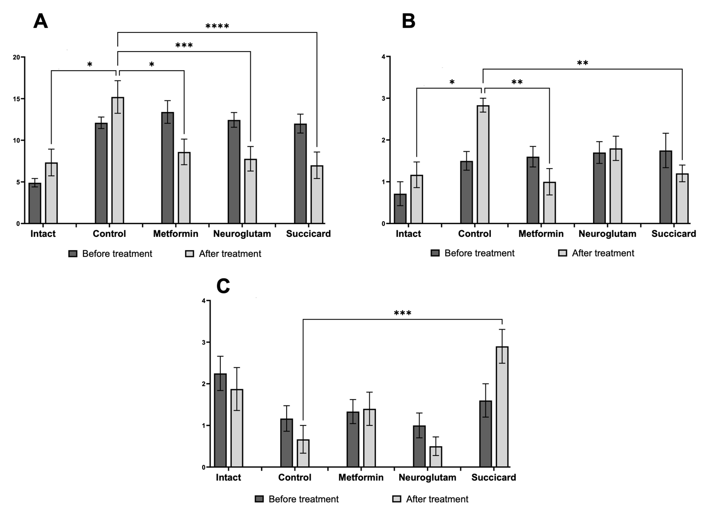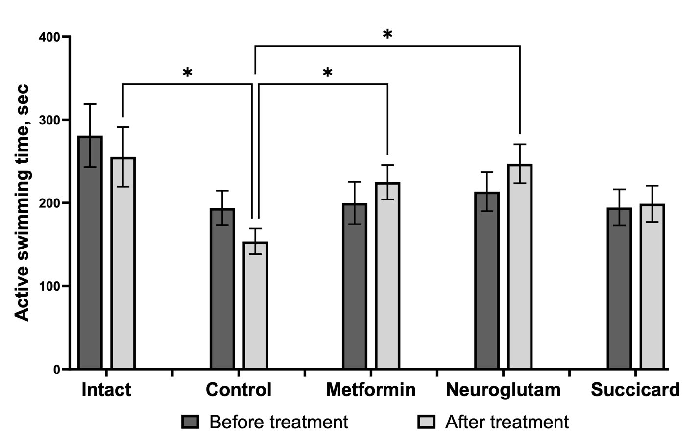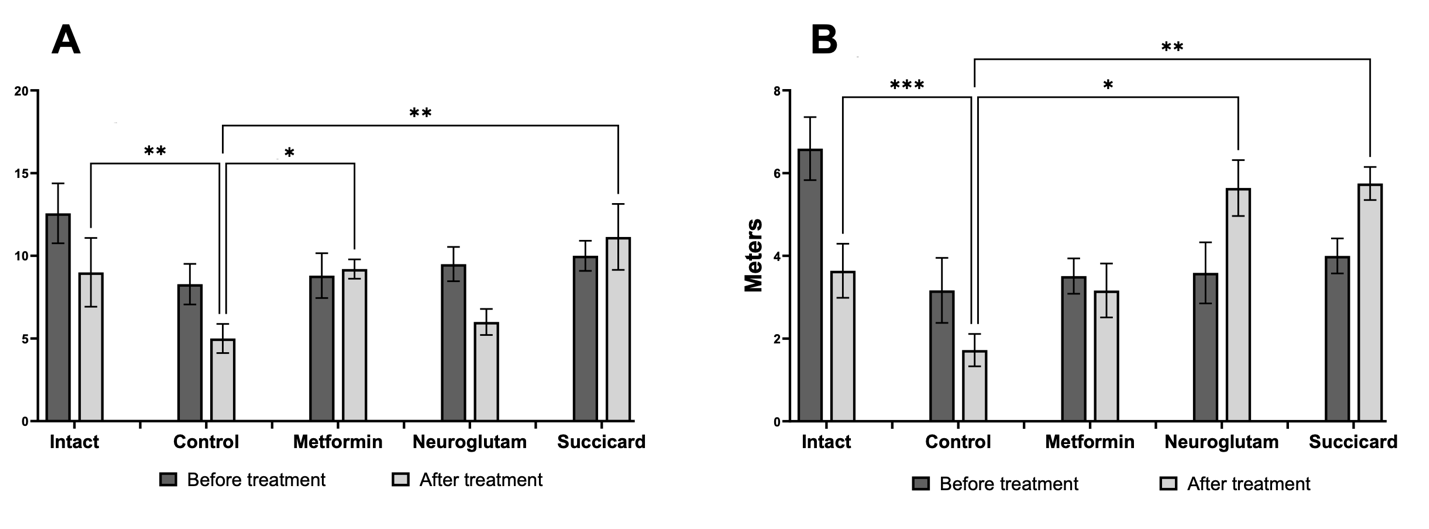 In the forced swimming with a load test, after the course of therapy, a statistically significant increase in the mean active swimming time compared to the diabetes control group was recorded only in the neuroglutam group (Fig. 6). In the metformin group, a trend towards increased swimming time was observed, but the differences with the control group did not reach the level of statistical significance. In the succicard group, the swimming time indicators practically did not differ from the control group and showed no dynamics compared to baseline measurements before treatment. The absence of a significant effect of succicard in this test, as well as in the Rotarod test, despite its efficacy in other behavioral tests, may indicate the selectivity of its action primarily on cognitive functions rather than physical endurance.
