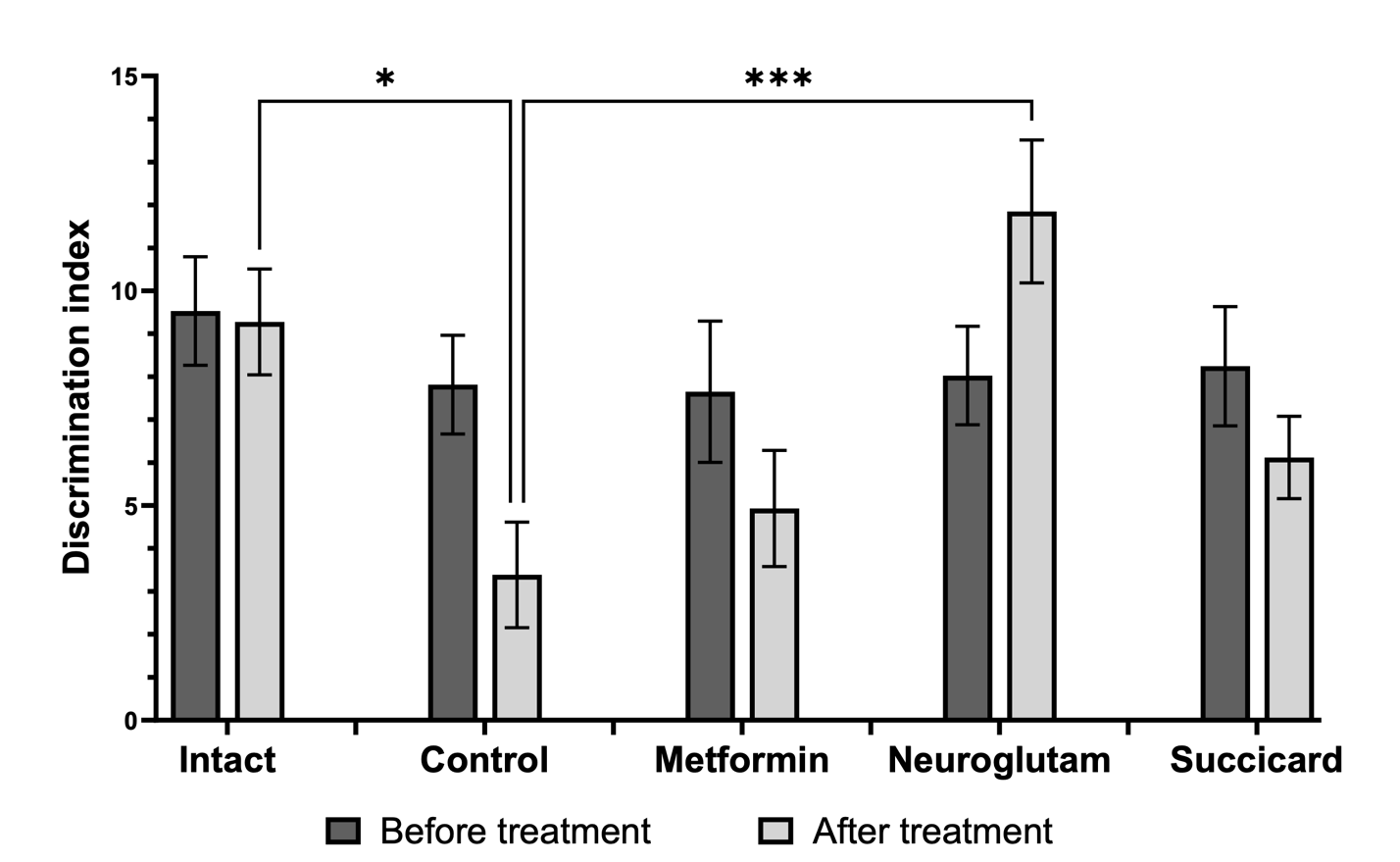 Figure 4. Results of the novel object recognition test before and after therapy. Note: Significance is shown only for post-treatment groups; * – p<0.05 compared to control group; *** – p<0.001 compared to control group (Kruskal-Wallis rank analysis and the Dunn post-test); data shown as the mean ±SEM.