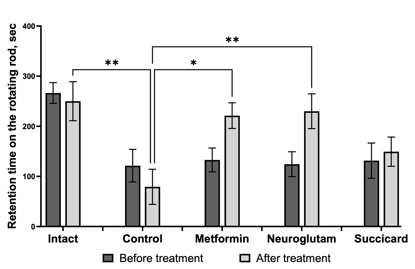 Figure 5. Retention time on the rotating rod before and after therapy. Note: Significance is shown only for post-treatment groups; * – p<0.05 compared to control group; ** – p<0.01 compared to control group (Kruskal-Wallis rank analysis and the Dunn post-test); data shown as the mean ±SEM; sec – seconds.