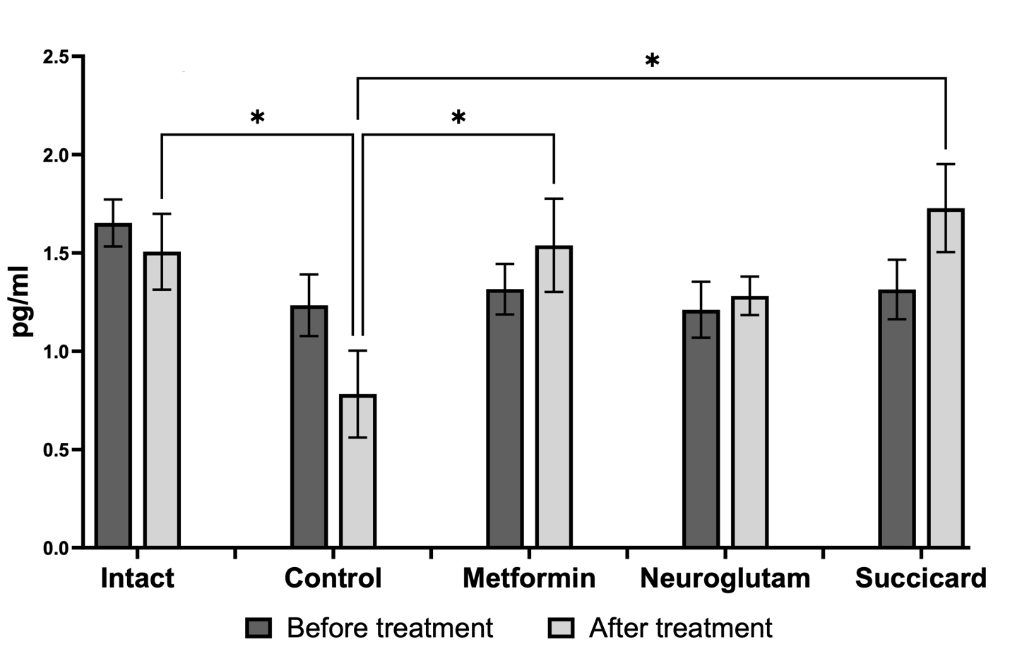 Enzyme-linked immunosorbent assay of serum Klotho protein concentration revealed significant changes in this aging biomarker during the experiment (Fig. 7). Before the start of therapy, the Klotho protein level in the intact group did not statistically significantly exceed the indicators of the diabetes control group. After the course of treatment, an expected age-dependent decrease in Klotho level was recorded in the intact group. A statistically significant increase in Klotho protein level compared to the control group was detected in the metformin and succicard groups, indicating their geroprotective potential. In the neuroglutam group, the Klotho protein concentration did not decrease after the course of therapy and was higher than the control group indicator. The obtained results demonstrate that metformin, neuroglutam, and succicard have the ability to counteract the decrease in Klotho protein level associated with accelerated aging in diabetes, which is consistent with the improvement in metabolic and behavioral indicators in these groups.