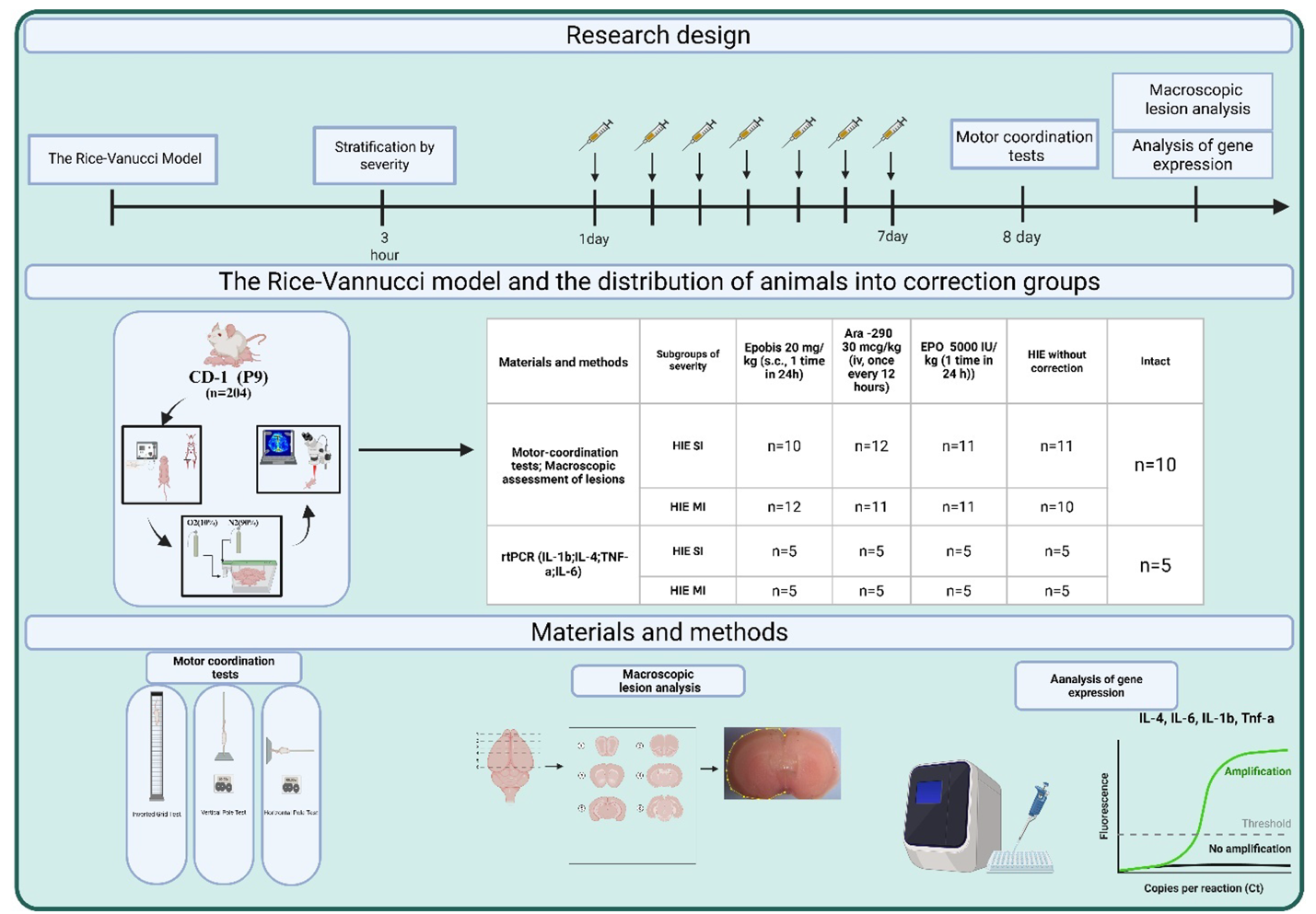To form experimental groups, CD-1 animals were mated at a male-to-female ratio of 1:3. On the following day, the presence of a copulatory plug was recorded, and the date of visualization was taken as the first day of pregnancy. After 20–21 days, offspring were obtained in a total number of 204 animals. After birth, litters were mixed and fostered to lactating females with no more than 8 pups per female, maintaining an equal number of animals per foster dam. Modeling neonatal fetal hypoxia-ischemia (HIE) using a Rice–Vannucci modification was performed at 9 days of age. Three hours after pathology modeling, animals were stratified into mild and moderate HIE severity groups as previously described, using the RFLSI-ZW system (RWD Life Science, China), followed by allocation of animals to treatment groups (Table 1). The first injection of the studied drugs was administered on the day of pathology modeling after group assignment. EPO and Epobis were administered once every 24 hours subcutaneously, while Ara-290 was administered every 12 hours intraperitoneally for 7 days. Seven days after the therapy, the effect of pharmacological correction on changes in motor-coordination functions was evaluated, followed by assessment of changes in macroscopic lesion volume and analysis of gene expression levels of IL-4, IL-1b, IL-6, and TNF-α.