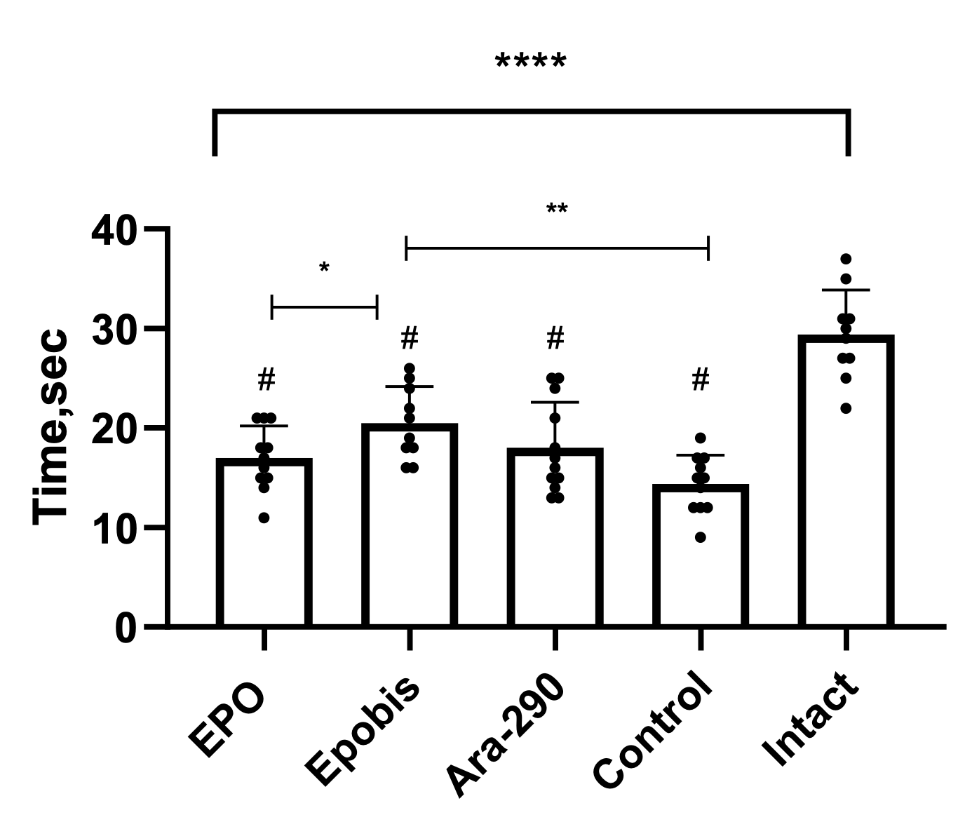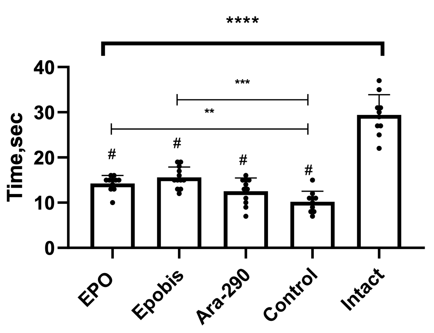 Figure 1. Effect of EPO (5000 IU/kg), Epobis (20 mg/kg), and Ara-290 (30 µg/kg) on holding time in the inverted grid test during correction of mild HIE 7 days after pathology modeling. Note: # – comparison with the intact group; explanations are provided in the text.