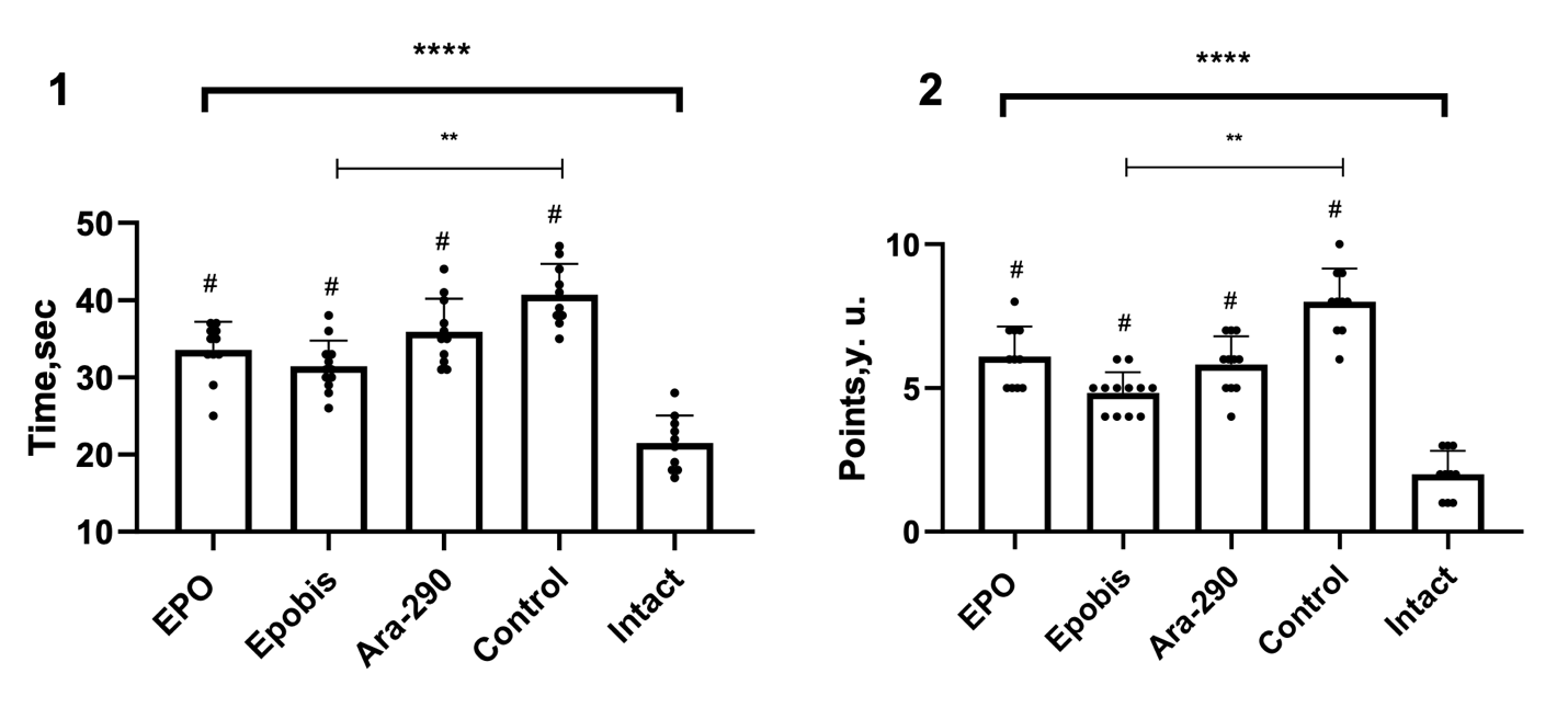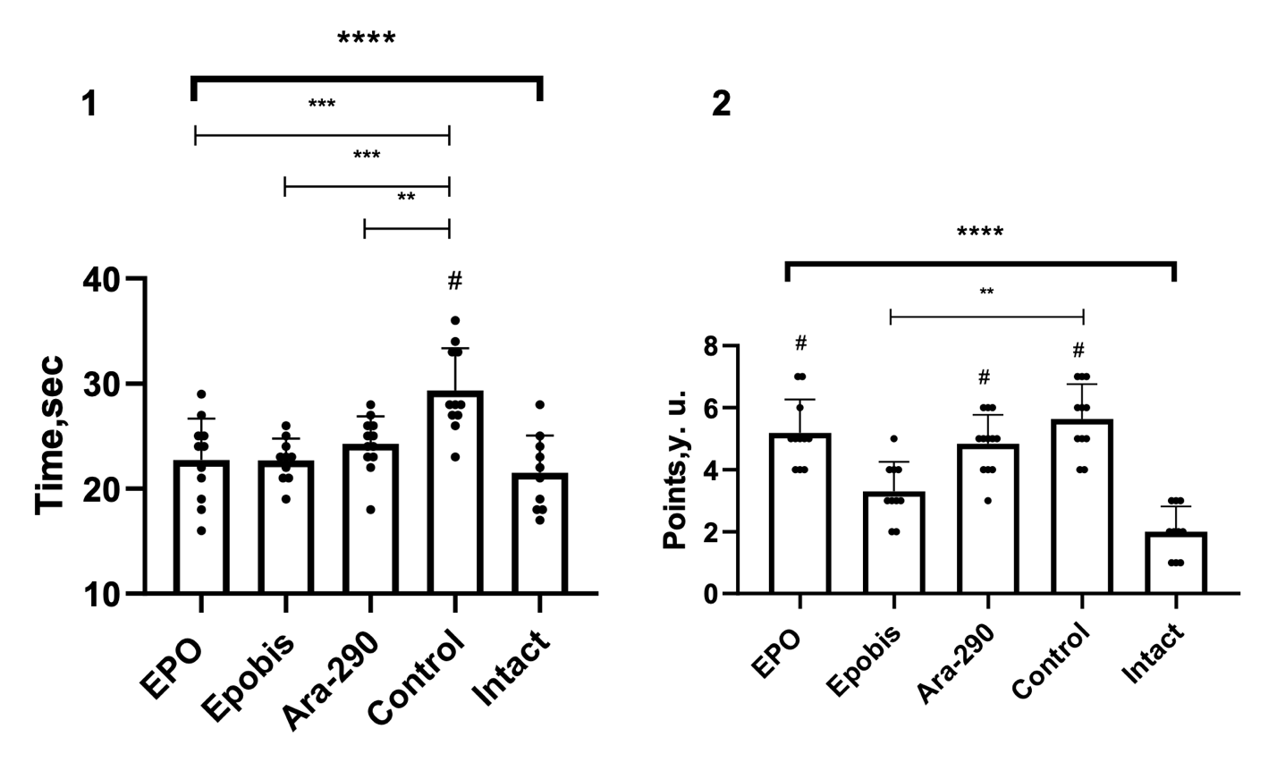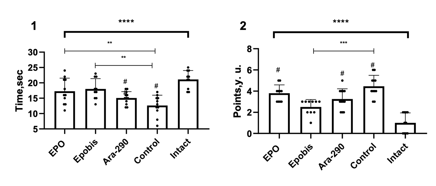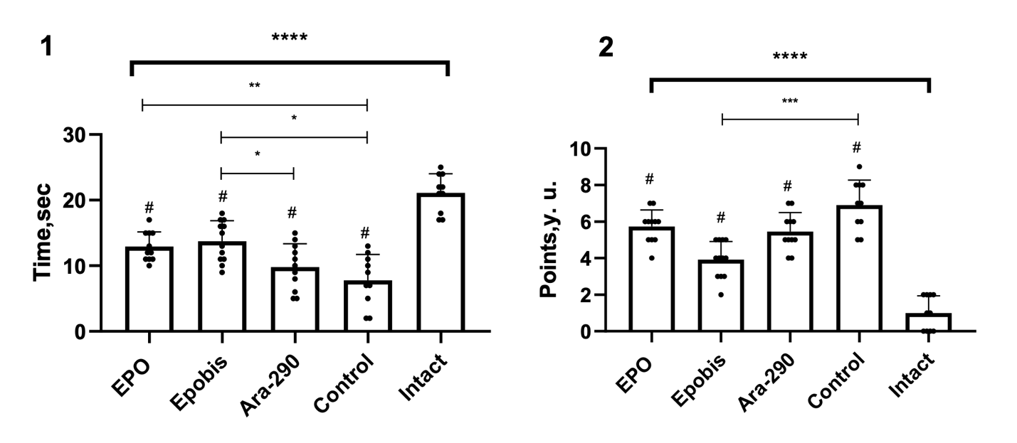 Figure 6. Effect of EPO (5000 IU/kg), Epobis (20 mg/kg), and Ara-290 (30 µg/kg) on the time to complete the horizontal pole test and changes in accompanying neurological signs during correction of moderate HIE 7 days after pathology modeling. Note: 1 – time to complete the horizontal pole test; 2 – change in accompanying neurological signs; # – comparison with the intact group; explanations are provided in the text.