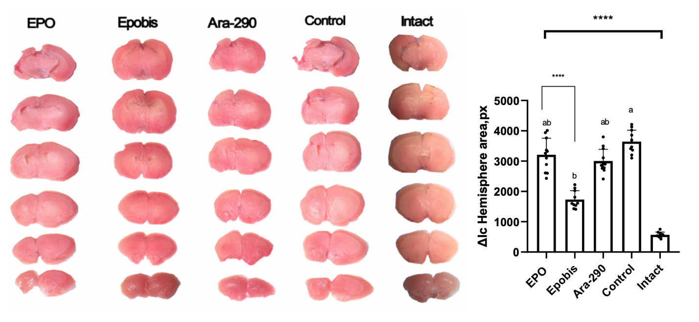 In mild HIE, the lesion volume in the untreated group was 3644 ± 374.7 px. In the treatment groups, a reduction in the volume of injured tissue was observed by 32.7% in the EPO group (2454 ± 272.5 px), by 54.2% in the Epobis group (1733 ± 291.8 px), and by 35% in the Ara-290 group (2369 ± 271.1 px) compared with the control group values.