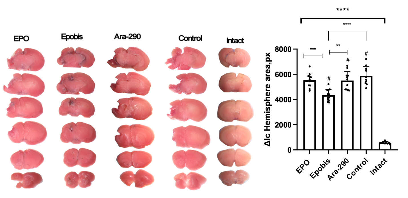Thus, in the mild HIE model, Epobis demonstrated the greatest neuroprotective effect, providing a more pronounced restoration of motor-coordination functions, reduction of accompanying neurological deficit during testing, and maximal decrease in macroscopic injury volume, whereas EPO and Ara-290 exerted a moderate effect and were inferior to Epobis in most parameters. In moderate HIE, the most reproducible improvements in motor function were observed with Epobis and EPO compared with Ara-290. Importantly, a statistically significant reduction in macroscopic lesion volume and a more pronounced attenuation of neurological symptomatology compared with EPO and Ara-290 were confirmed only for Epobis. At the molecular level, Epobis provided the most pronounced immunomodulation, producing an anti-inflammatory shift in mild HIE and, in moderate HIE, significantly reducing IL-6 while simultaneously inducing IL-4 most effectively.