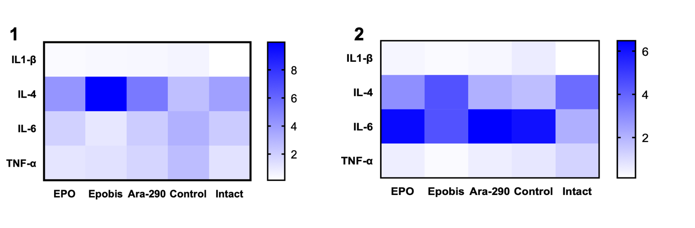 Figure 9. Effect of EPO (5000 IU/kg), Epobis (20 mg/kg), and Ara-290 (30 µg/kg) on quantitative changes in expression of neuroinflammation marker genes in the phase of reperfusion-inflammation changes during correction of mild and moderate HIE. Note: 1 – illustration of quantitative changes in gene expression during correction of mild HIE; 2 – illustration of quantitative changes in gene expression during correction of moderate HIE presented as a heat map.