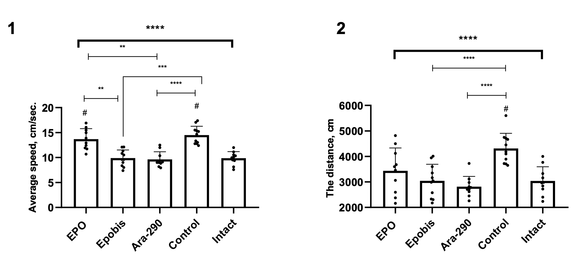 Figure 1. Effect of EPO (5000 IU/kg), Epobis (20 mg/kg), and Ara-290 (30 μ/kg) on mean velocity and total distance traveled in the open field test during correction of mild HIE at day 15 after injury induction. Note: 1 – Changes in mean velocity in the mild HIE treatment groups; 2 – Changes in total distance traveled in the mild HIE treatment groups. # – comparison with the intact group; explanations are provided in the text.
