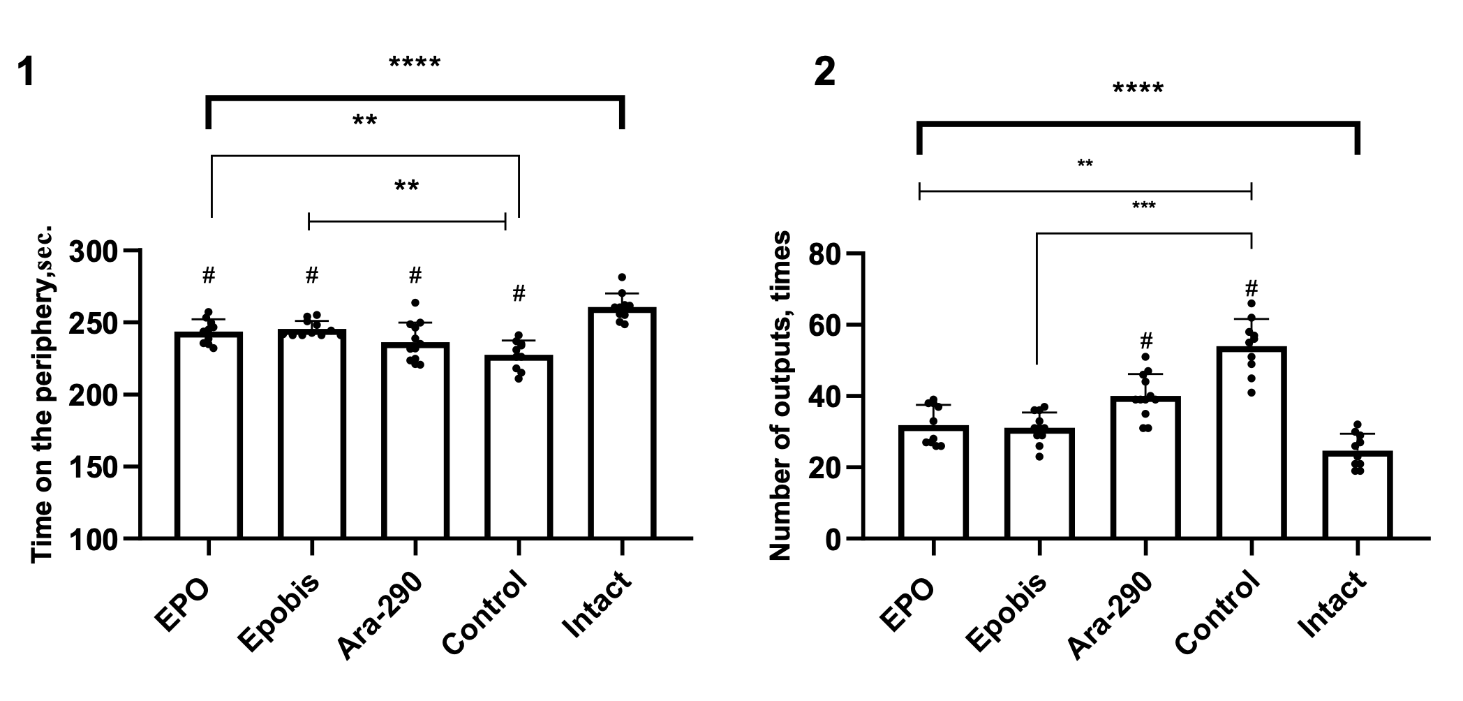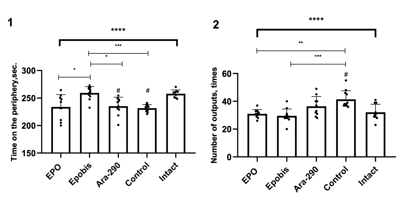 Figure 6. Effect of EPO (5000 IU/kg), Epobis (20 mg/kg), and Ara-290 (30 μ/kg) on time spent in the peripheral zone and the number of transitions from the periphery to the center in the open field test during correction of moderate HIE at day 15 after injury induction. Note: 1 – Change in time spent in the peripheral zone; 2 – Change in the number of center entries. # – comparison with the intact group; explanations are provided in the text.