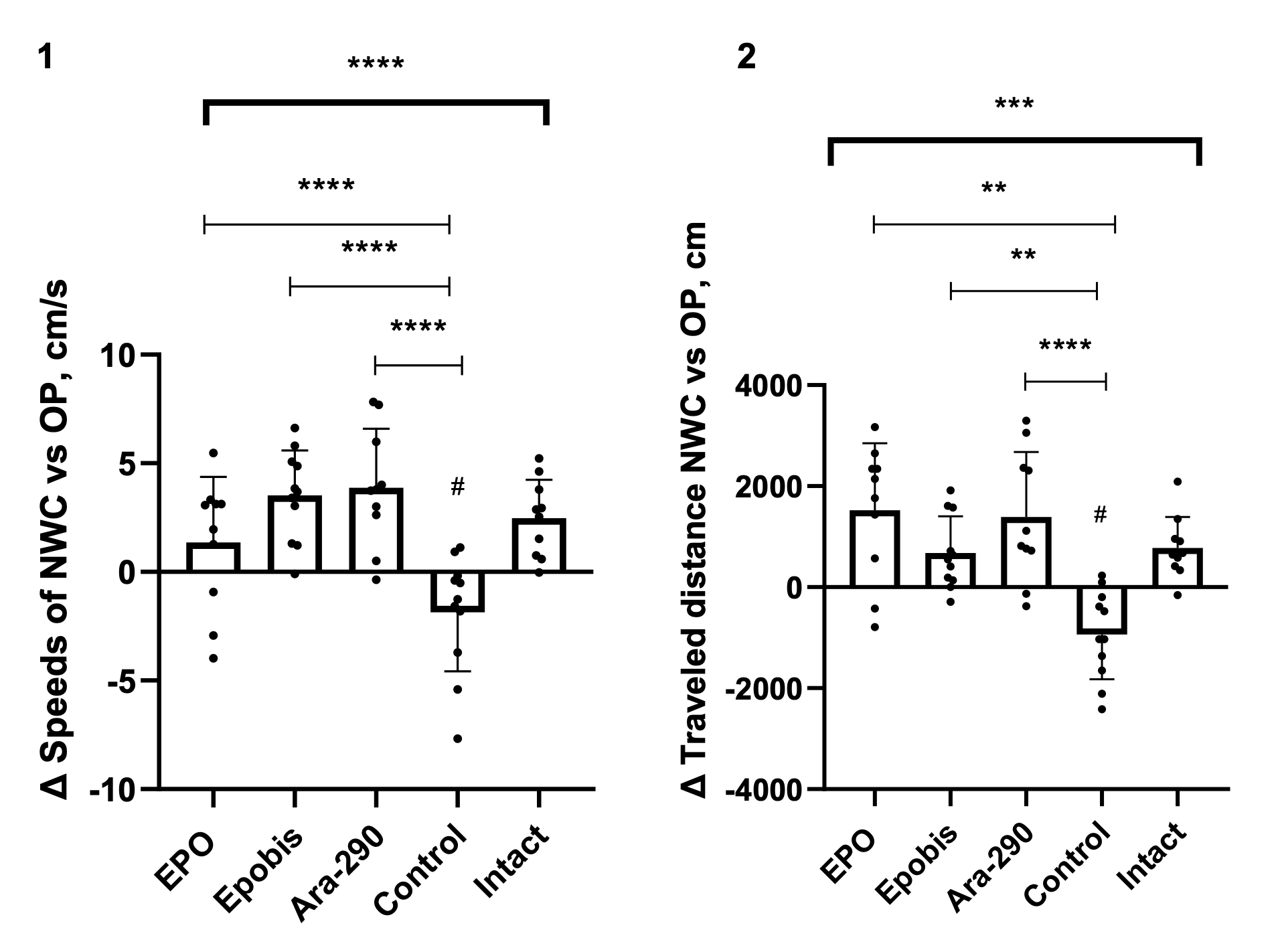 Figure 7. Effect of EPO (5000 IU/kg), Epobis (20 mg/kg), and Ara-290 (30 μ/kg) on mean velocity and total distance traveled in the caffeine neurostimulation test during correction of moderate HIE in the remodeling phase at day 16 after injury induction. Note: 1 – Change in mean velocity in the caffeine neurostimulation test; 2 – Change in total distance traveled in the caffeine neurostimulation test. # – comparison with the intact group; explanations are provided in the text.