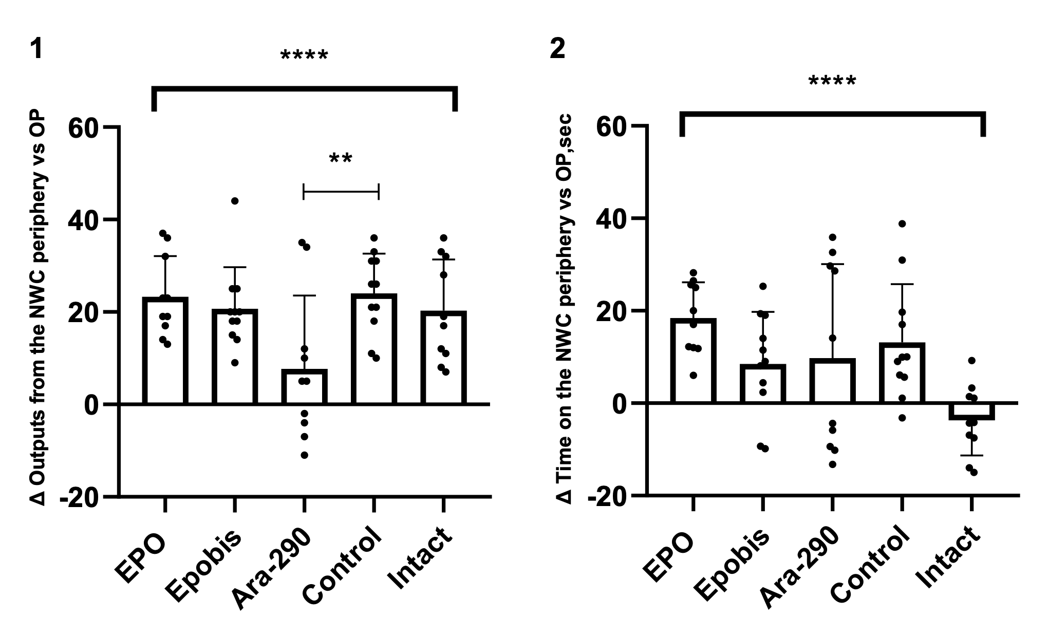 Statistically significant differences versus the untreated HIE group were observed for EPO (p < 0.01) and Epobis (p < 0.001), but not for Ara-290; a difference was also detected between the untreated HIE and intact groups (p < 0.0001) (Fig. 6-2).