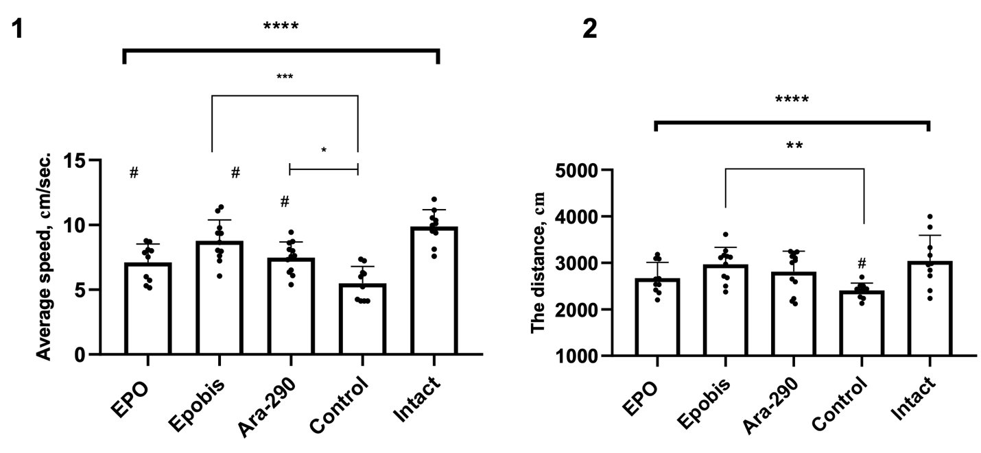 Accordingly, the caffeine neurostimulation test results confirm these events and account for the observed changes. In the treatment groups, a reduction in the amplitude of the locomotor response was observed, with the most pronounced attenuation of hyperreactivity in the Epobis group (3.321 ± 1.955 cm/s; p < 0.0001) and, to a lesser extent, in the Ara-290 group (4.342 ± 1.105 cm/s; p < 0.01). In the EPO group (5.467 ± 1.857 cm/s), increased reactivity relative to the intact level persisted, and the response was also more pronounced than in the Epobis group (p < 0.05), indicating incomplete normalization of induced locomotion with this correction regimen (Fig. 7-1).