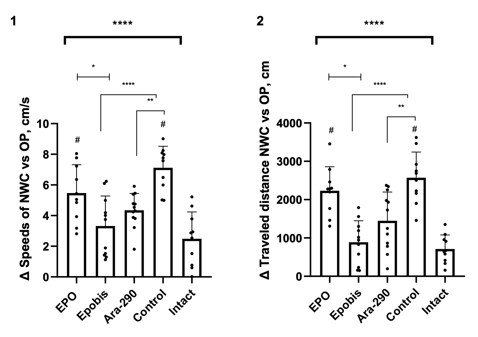 Figure 3. Effect of EPO (5000 IU/kg), Epobis (20 mg/kg), and Ara-290 (30 μ/kg) on mean velocity and total distance traveled in the caffeine neurostimulation test during correction of mild HIE in the remodeling phase at day 16 after injury induction. Note: 1 – Change in mean velocity in the caffeine neurostimulation test; 2 – Change in total distance traveled in the caffeine neurostimulation test. # – comparison with the intact group; explanations are provided in the text.