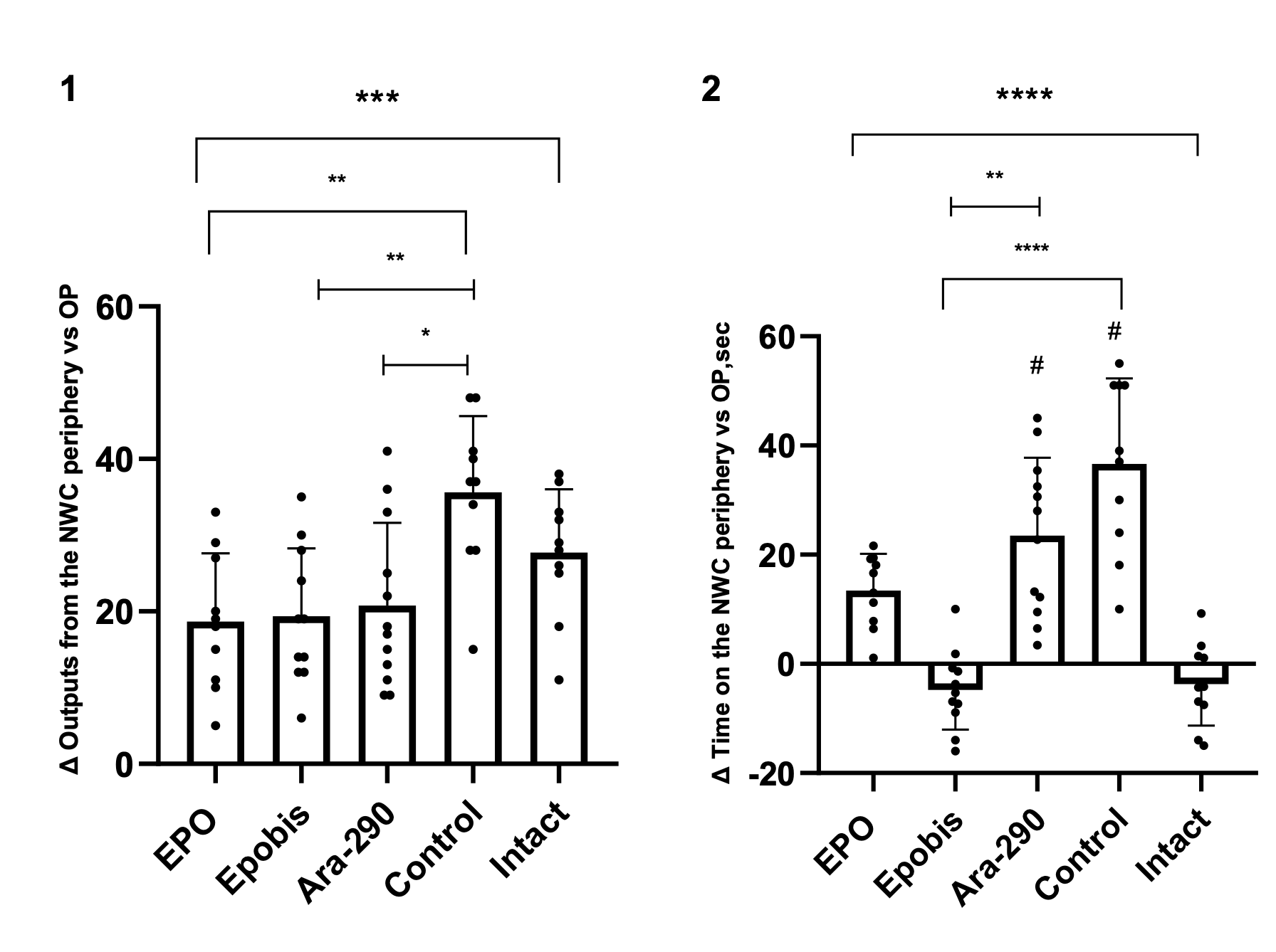 Figure 4. Effect of EPO (5000 IU/kg), Epobis (20 mg/kg), and Ara-290 (30 μ/kg) on the number of transitions from the periphery to the center and time spent in the peripheral zone in the caffeine neurostimulation test during correction of mild HIE in the remodeling phase at day 16 after injury induction. Note: 1 – Change in transitions from the periphery to the center in the caffeine neurostimulation test; 2 – Change in time spent in the peripheral zone in the caffeine neurostimulation test. # – comparison with the intact group; explanations are provided in the text.