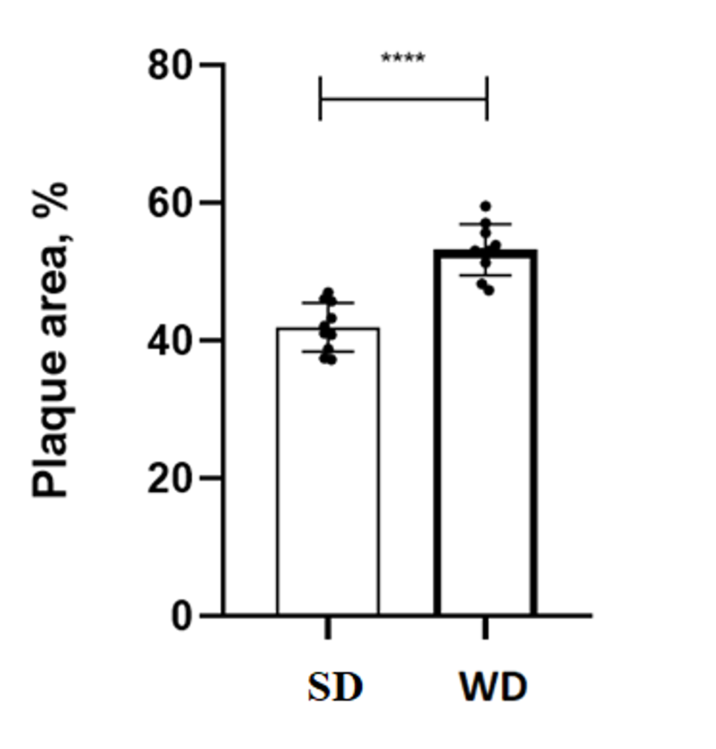 Figure 2. Quantitative assessment of atherosclerotic lesion area in ApoE⁻/⁻ mice fed a standard (SD) or Western (WD) diet. Note: **** p-value < 0.0001.