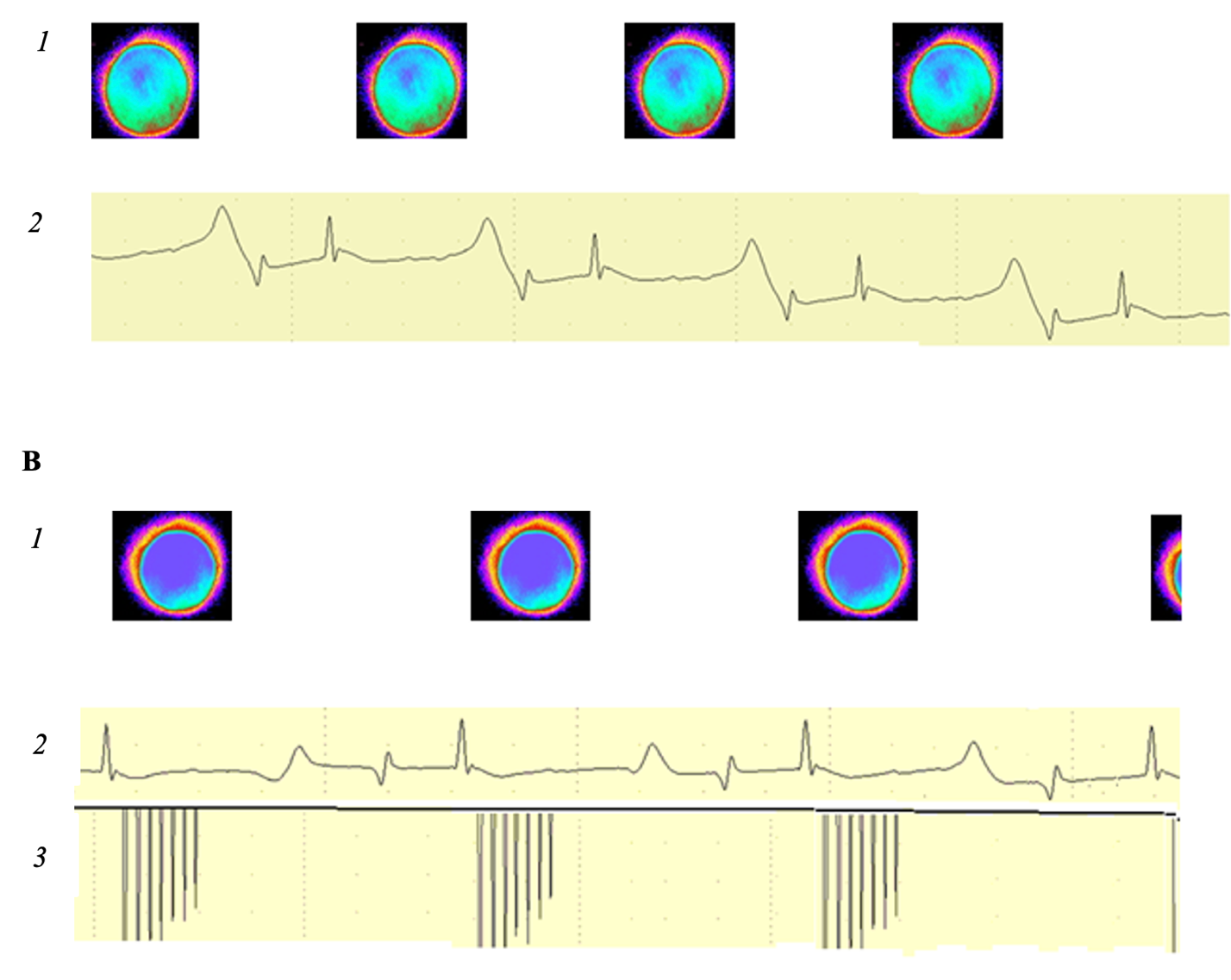 Figure 2. Luminescence foci in the medulla oblongata of a frog (1), ECG (2) and volleys of electrical impulses applied to the brain (3). Note: A – initial state; B – vagal-cardiac synchronization.