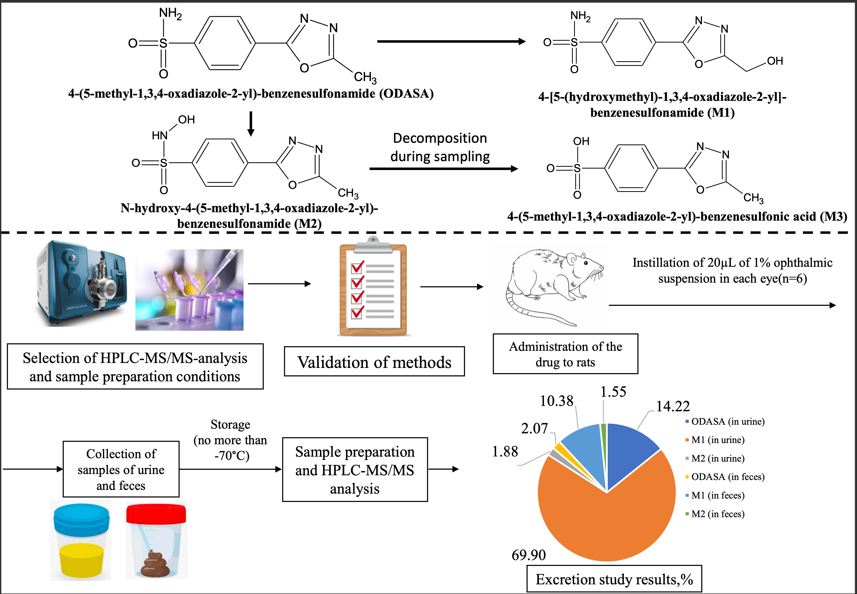 Materials and Methods: The ODASA excretion was investigated on 6 Wistar rats. The 1% suspension of ODASA was instilled into each eye in a volume of 20μL (1.6 mg/kg). Excreta were collected using metabolic cages. Sampling of feces was performed every 24 h for 384 h after the administration. Urine was taken frequently in first day of experiment: 4 h, 8 h and 12 h after administration. Samples was stabilized and frozen (temperature <-70°C). Quantification of ODASA, 4-[5-(hydroxymethyl)-1,3,4-oxadiazole-2-yl]-benzenesulfonamide (M1), N-hydroxy-4-(5-methyl-1,3,4-oxadiazole-2-yl)-benzenesulfonamide (M2), 4-(5-methyl-1,3,4-oxadiazole-2-yl)-benzenesulfonic acid (M3) was carried out by HPLC-ESI-MS/MS. M2 was unstable in samples, and its content was calculated by summing the concentrations of M2 and its degradation product M3. Kinetex Phenyl Hexyl column (50*4.6 mm, 2.6 µm) was used for chromatographic separation.