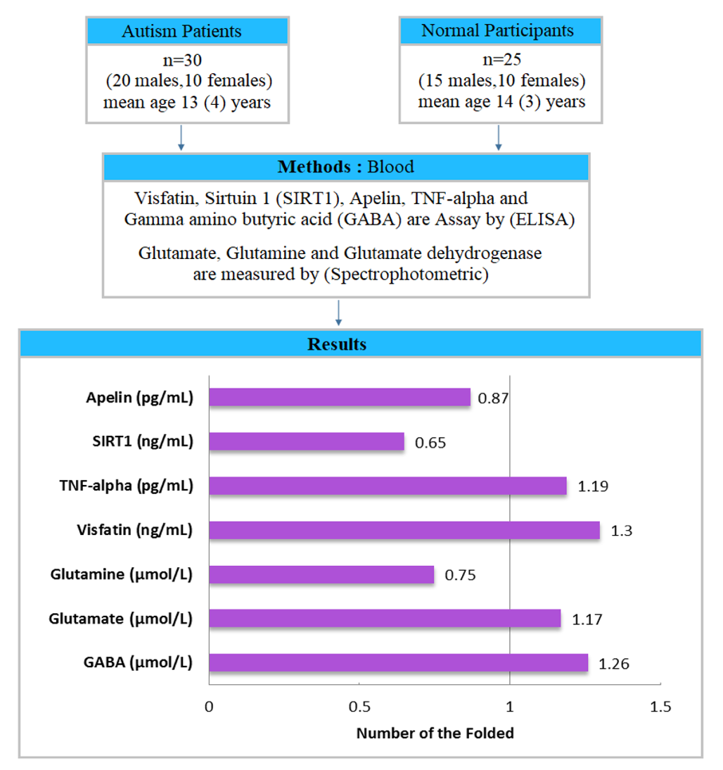 Materials and Methods: The study was conducted on 30 patients (20 males, 10 females) with autism, mean age 13 (4) years and 25 normal participants (15 males, 10 females), mean age 14 (3) years. The blood levels of visfatin, sirtuin 1, apelin, tumor necrosis factor-alpha, glutamate dehydrogenase, gamma aminobutyric acid, glutamate, and glutamine were analyzed in all participants by using different techniques according to the manufacturer.