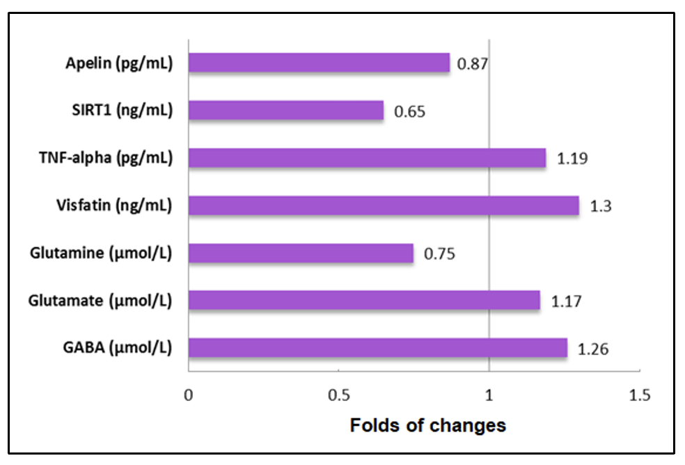 Results: The statistical analyses of the data for the patients versus normal participants showed high prominent elevation in serum levels of visfatin (P=0.006), tumor necrosis factor-alpha (P=0.001), gamma aminobutyric acid (P=0.002), and glutamate (P=0.001). Conversely, high appreciable reductions were noted in serum levels of glutamine (P<0.001), sirtuin 1 (P=0.002), and apelin (P<0.001). Whereas non-momentous rise (P=0.083) was noted in serum level of glutamate dehydrogenase.