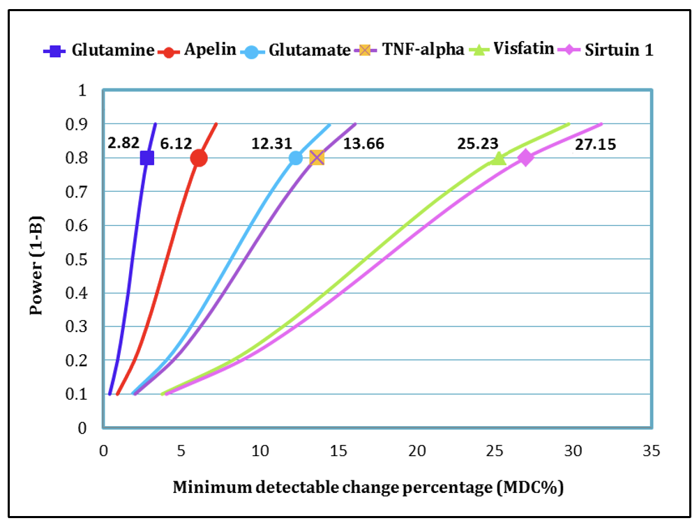 Contrariwise, the autistic patient exhibited a significant decrease in serum levels of SIRT1 (P=0.002) and neuropeptide apelin (P<0.001) versus control participants. As well, the degree of the decrease for SIRT1 was 0.65-fold and for neuropeptide apelin – 0.87-fold versus normal participants (Fig. 1). The minimum perceivable percentage changes within the mean levels of some selected variables such as glutamate, glutamine, visfatin, TNF-α, SIRT1, and apelin in autistic patients versus normal participants are summarized in Figure 2, assuming power of analysis (1-B) equals to 80%.