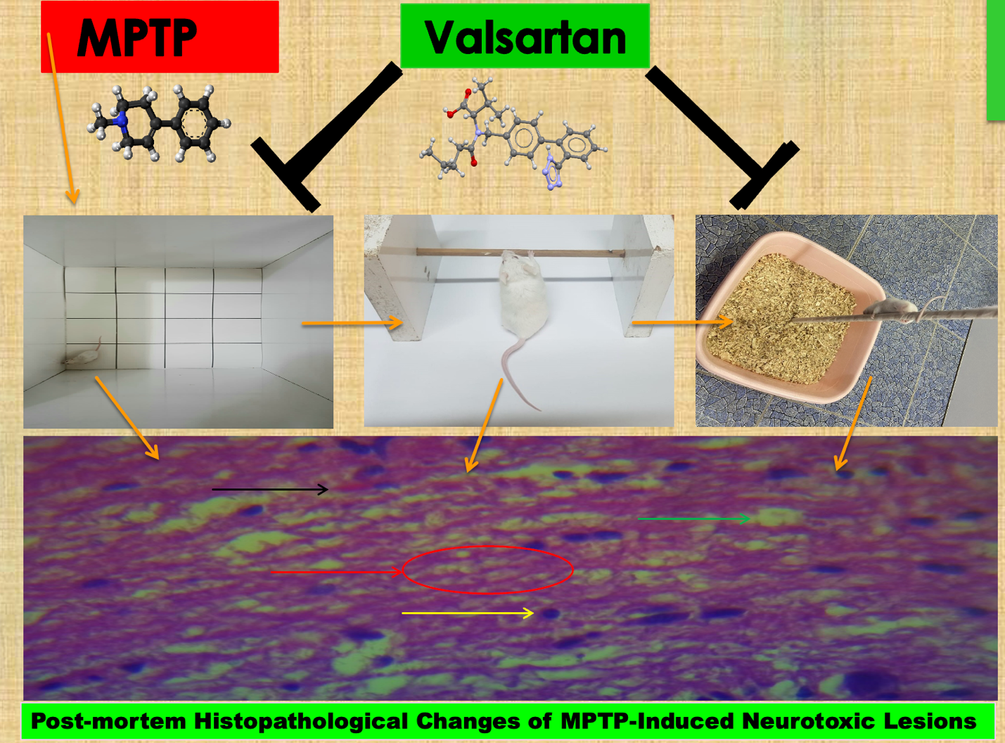 Materials and Methods: This study involved 40 male mice grouped into four groups (n=10). Group 1: The normal/healthy group obtained filtered water orally for 25 days. Group 2 got MPTP (30 mg/kg/day) intraperitoneally (IP) for 5 days, starting on day 15 to the close of day 19. Group 3 was given oral pramipexole (1 mg/kg/day) for 25 days, followed by an induction dose of MPTP (30 mg/kg/day) (IP) 60 minutes later. Group 4 received valsartan orally (30 mg/kg/day) for 25 days and then underwent induction with MPTP (30 mg/kg/day) (IP) 60 minutes after valsartan; on day 26, all animals were euthanized, and a biopsy of brain tissues was collected for examination.