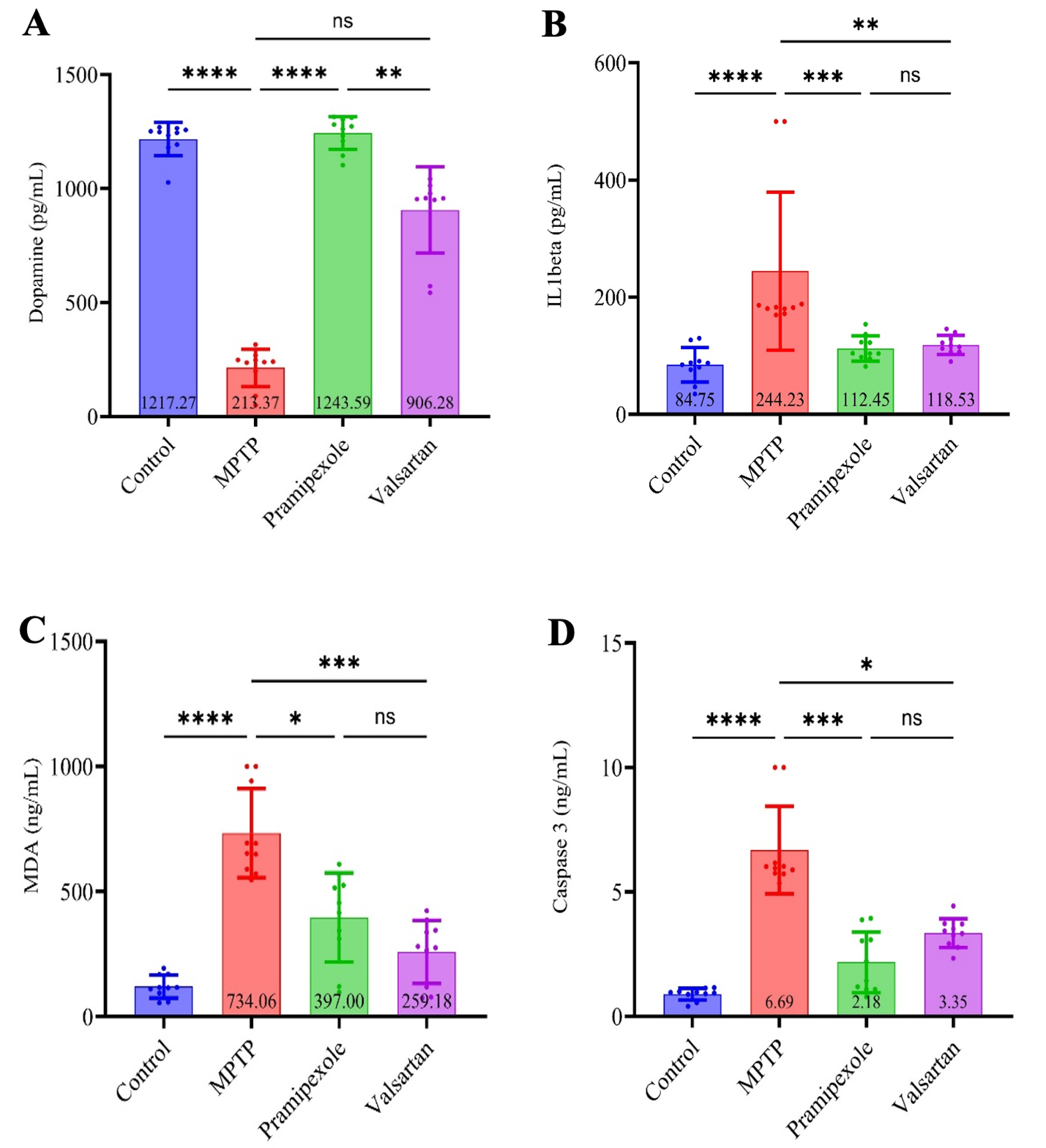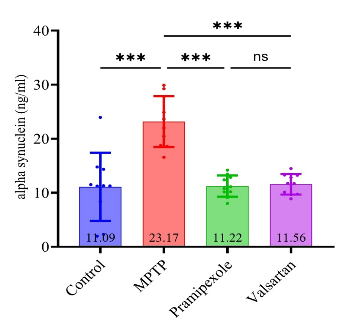 A crystalline powder of MPTP hydrochloride was bought from Merere (China). Pramipexole medication was bought via Boehringer-Ingelheim Pharma-GmbH & Co. KG (Germany). Valsartan was bought from Sigma-Aldrich (USA). MDA, IL-1Beta, DA, and Cas 3 mouse ELIZA kits were bought via Elabscience (USA), while α-synuclein mouse ELIZA kits were acquired by Mybiosources (USA). Buffering phosphate solutions is sourced by Reagent-World (USA), and formaldehyde solutions 37% - via Fluka-Chemical (UK).