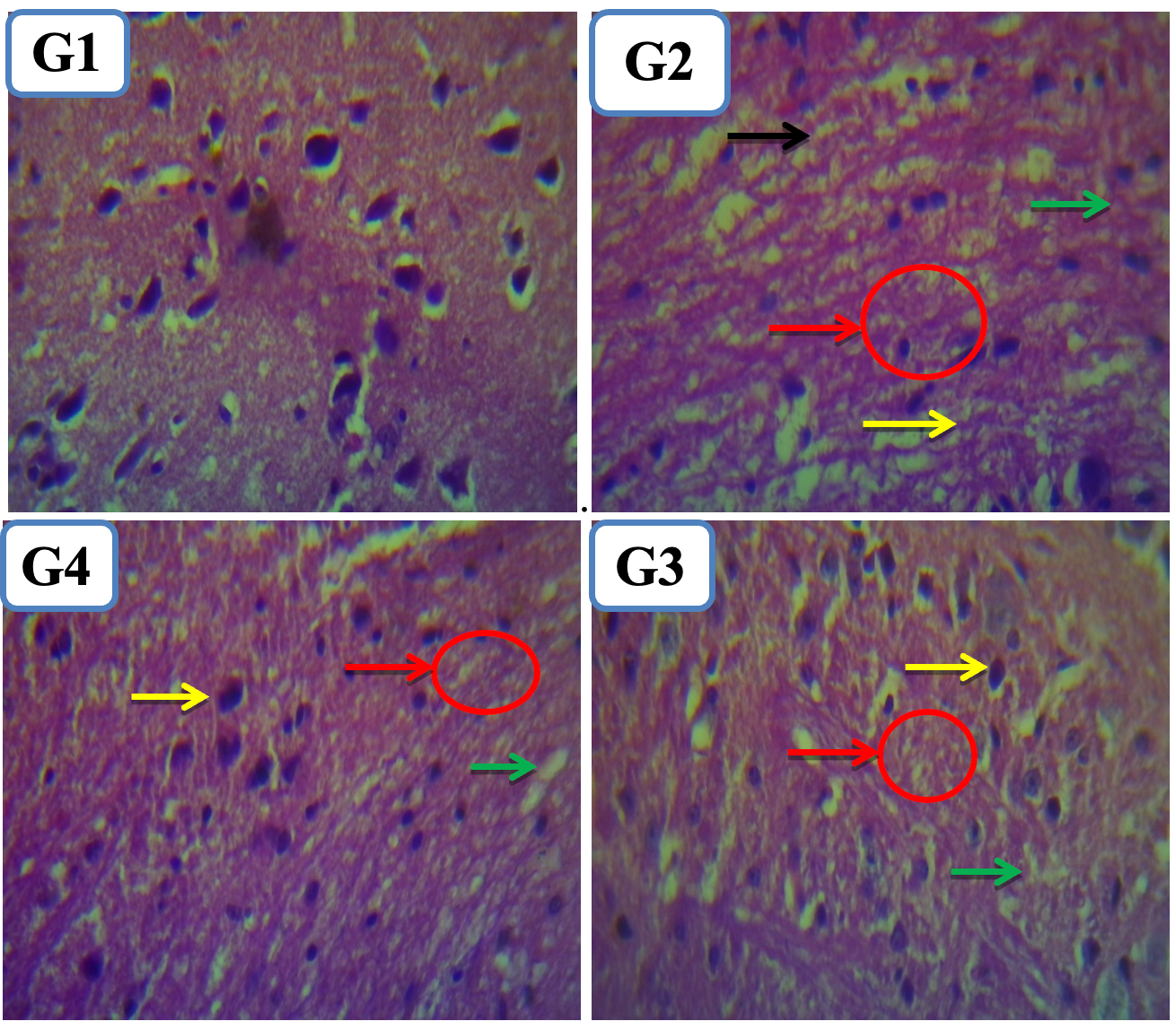 Small slices of the mid-brains were preserved in 10% formaldehyde solution using the paraffin section procedure in order to assess for histological alterations in all groups (Hassan et al. 2023; Thammer et al. 2025). Brain tissues were dried in an increasing alcohol grades, then fixated, and wax embedded. After cutting paraffin slices to a thickness of 5-7 µm, hematoxylin-eosin staining was done (Habbas et al. 2025).