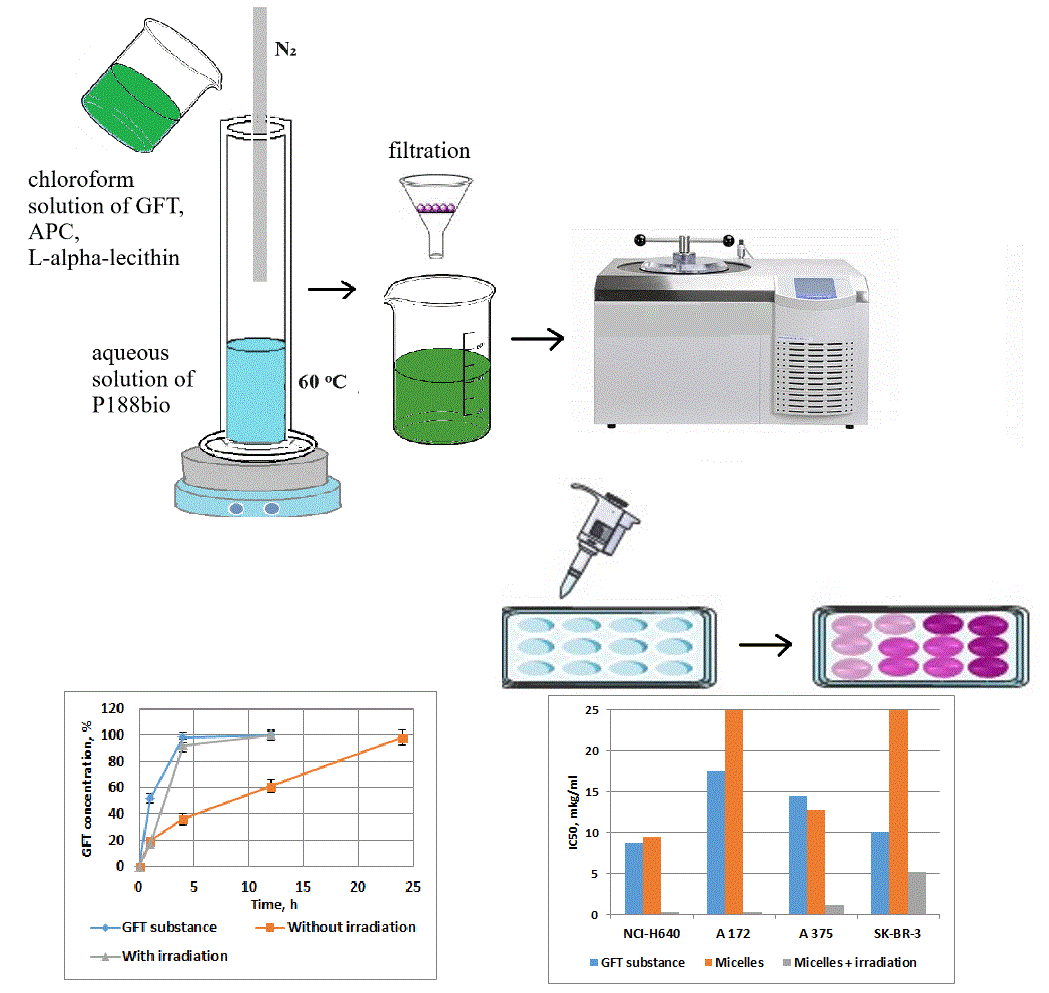 Materials and Methods: The micellar model was obtained by mixing/emulsifying the aqueous and organic phases using a continuous flow of nitrogen gas, an aqueous solution of poloxamer 188 as the aqueous phase, and a chloroform solution of the active substances as the organic phase. Conventional analytical and biological methods were used to characterize the obtained micelles. The average particle size and polydispersity index of the samples were determined by dynamic light scattering and microscopy. Release from particles was determined in vitro by quantifying free GFT released through the dialysis insert. Cytotoxic activity was studied on the cell lines of lung cancer NCI-H640, glioblastoma A 172, melanoma A 375, and breast cancer SK-BR-3.