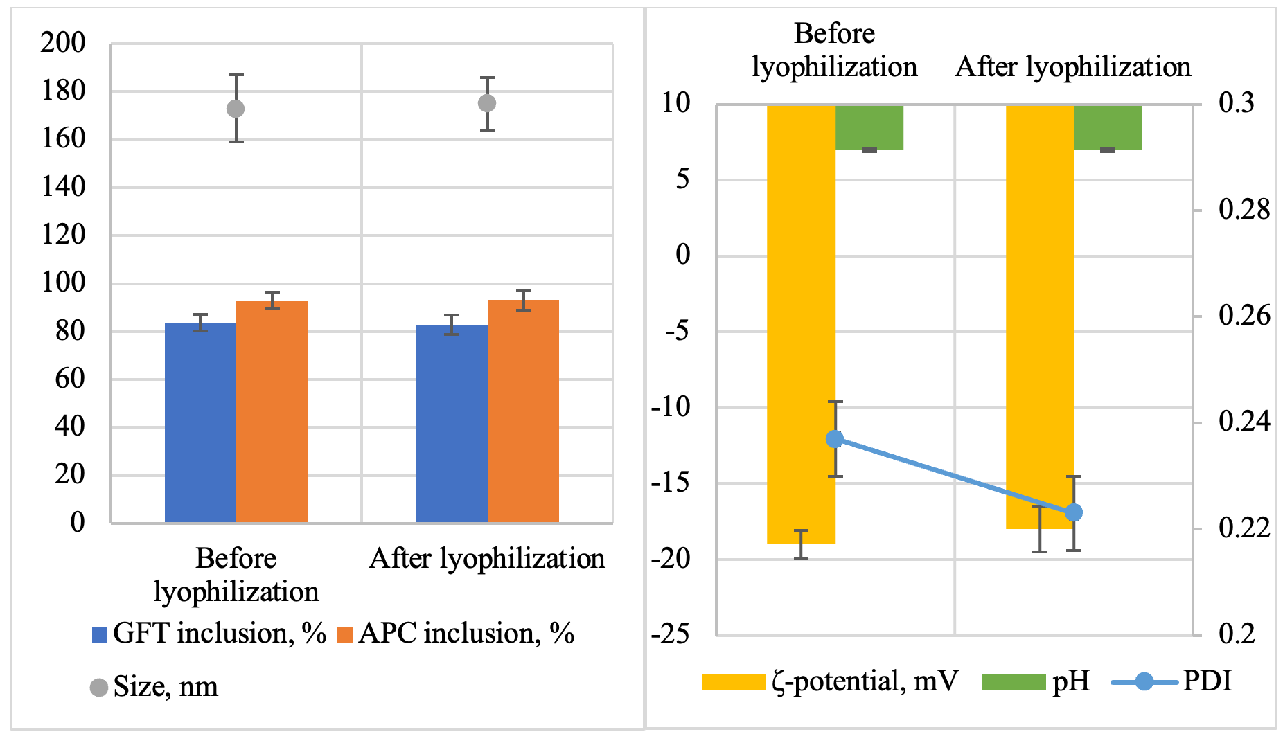 None of the quality characteristics changed significantly after lyophilization. The particle size remained in the nanoscale; the ζ-potential was negative. PDI did not exceed 0.3, i.e. it had a fairly narrow distribution (Fig. 1).