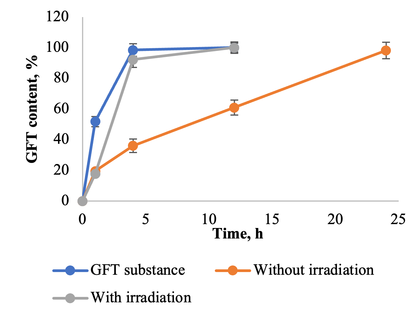 Figure 3. Study of the release kinetics of GFT substance and GFT from the micellar model in vitro without irradiation and with irradiation, 4 hours after the start of the experiment. Note: GFT – gefitinib, results were presented as the mean ± standard deviation.