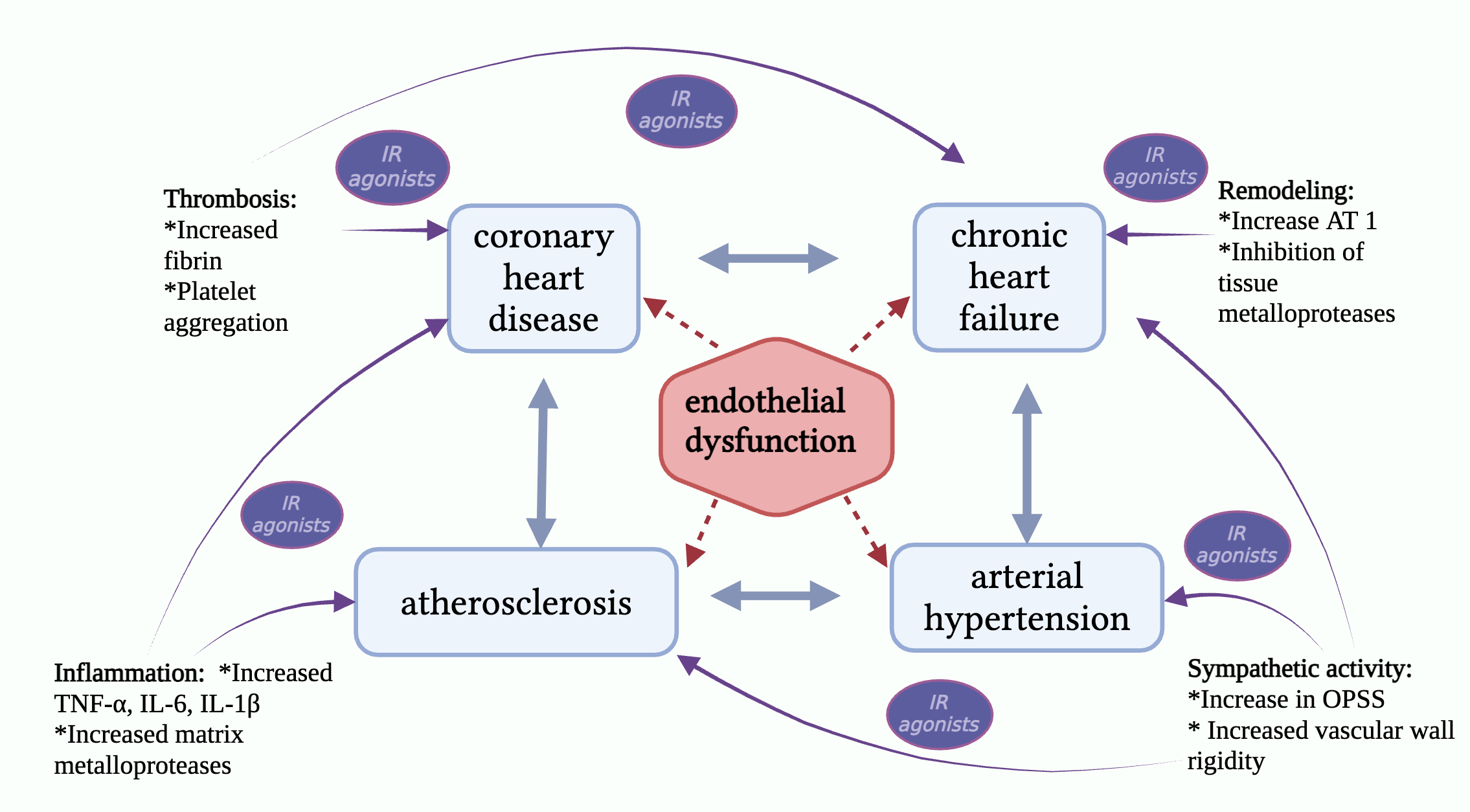 To understand the potential role of agonists IR in influencing the pathological cascades of CVC, basic information about the key mechanisms of hypertension, CHF, and atherosclerosis is presented below. Sympathetic activation, ED, chronic inflammation of the vascular wall and myocardium, and an increase in the pro-apoptotic orientation of cells can be distinguished among the basic pathological processes involved in the formation of all CVC links.