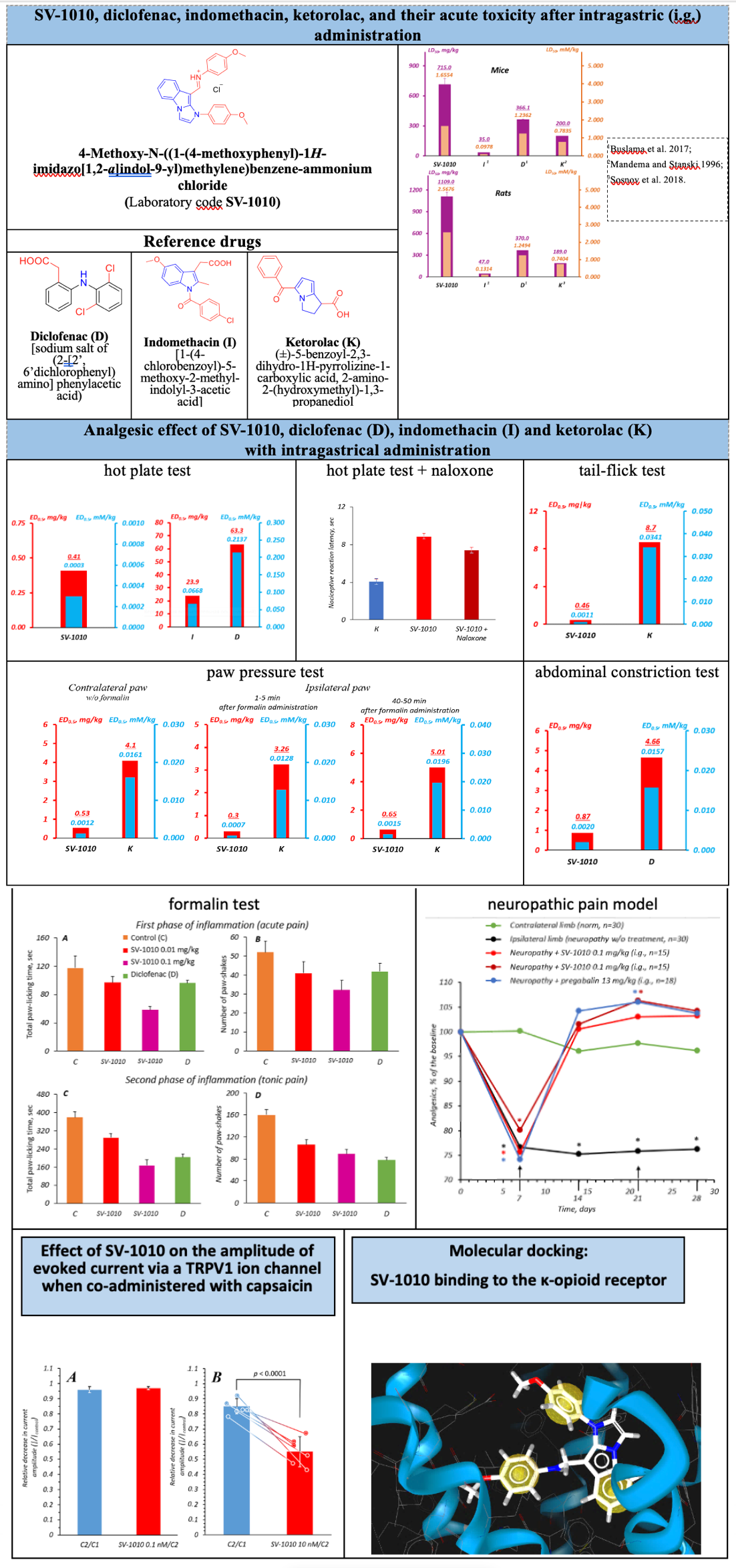 Results and Discussion: SV-1010 is less toxic than diclofenac, indomethacin, and ketorolac, exhibits a pronounced analgesic effect, but exceeds diclofenac, indomethacin, ketorolac, and pregabalin by the potency and therapeutic index. The treatment sites for SV-1010 to exert its analgesic effect are the supraspinal, supraspinal + peripheral, spinal, and peripheral levels of pain sensitivity. Of note is the high selectivity of SV-1010 to blocking TRPV1 ion channel and activating κ-opioid receptors.