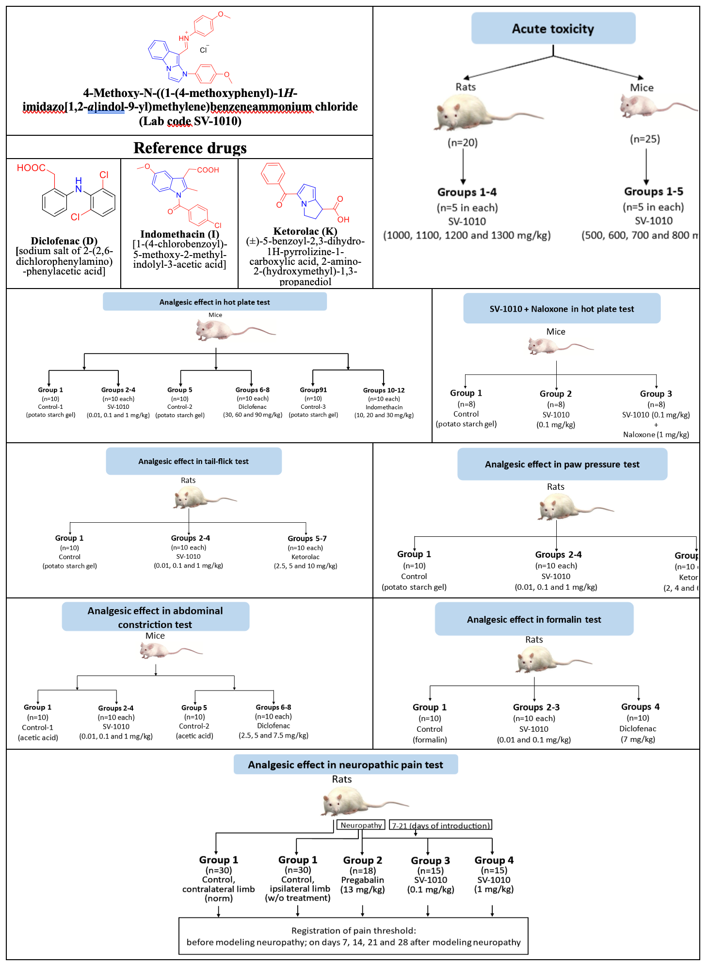 Сhemical substance 4-methoxy-N-((1-(4-methoxyphenyl)-1H-imidazo[1,2-a]indol-9-yl)methylene)benzene ammonium chloride under lab code SV-1010 (synthesized at the Southern Federal University, Rostov-on-Don, Russia), diclofenac (chemical substance, batch 23390D017, Armavir Biofactory, Russia), indomethacin (enteric-coated tablets, weighing 25 mg (Ozon LLC, Russia), ketorolac [film-coated tablets (Renewal Pharmaceutical Manufacturing Company, Russia)], pregabalin [hard-gelatin capsules (Moscow Endocrine Plant, Russia)], naloxone (naloxone hydrochloride dihydrate; Moscow Endocrine Plant, Russia), capsaicin (Sigma Aldrich, USA).