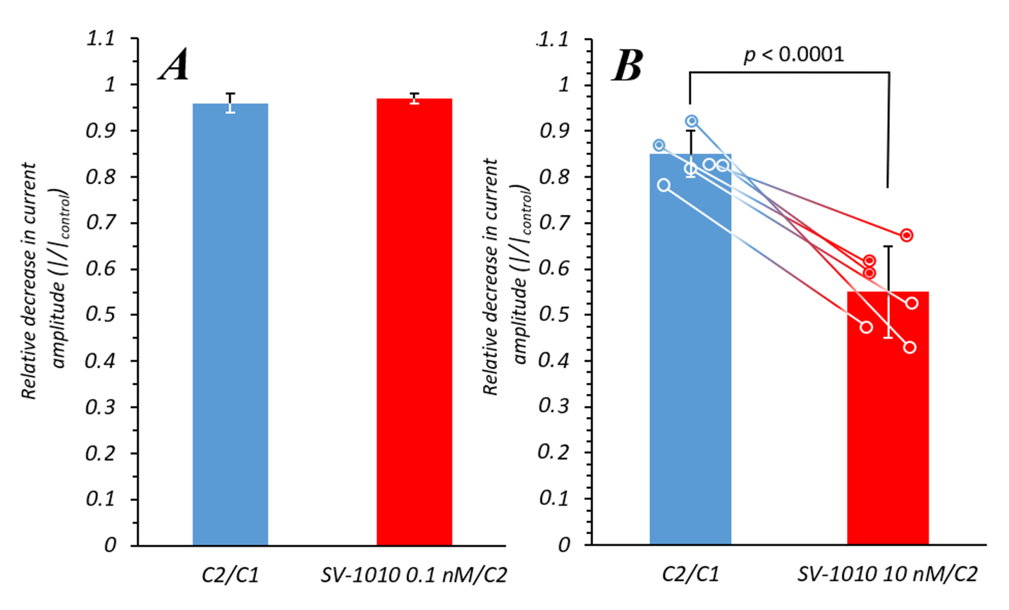 Consecutive applications of capsaicin can lead to the channel desensitization effect manifested in the reduction of amplitude therefore each response was normalized to the previous one on the same cell. The current amplitude after the application of SV-1010 at concentrations of 0.1 and 10 nM mixed with the agonist was compared with the current amplitude after the application of the agonist alone, each time normalizing the value to the amplitude of the previous measurement. Recordings from at least three independent cells were analyzed. The data obtained were presented as the mean value with standard deviation. The significance of differences was determined using Student’s t-test.