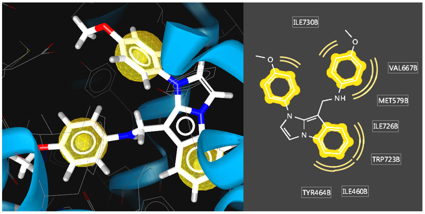 According to the analysis of the SV-1010 binding mechanism to the κ-opioid receptor site, the key binding amino acids are ILE730, VAL667, MET579, ILE726, TRP723, ILE460, and TYR464. Binding is mediated by three hydrophobic interactions between the benzene fragments of the SV-1010 structure and the above-mentioned amino acids of the κ-opioid receptor site (Fig. 4).