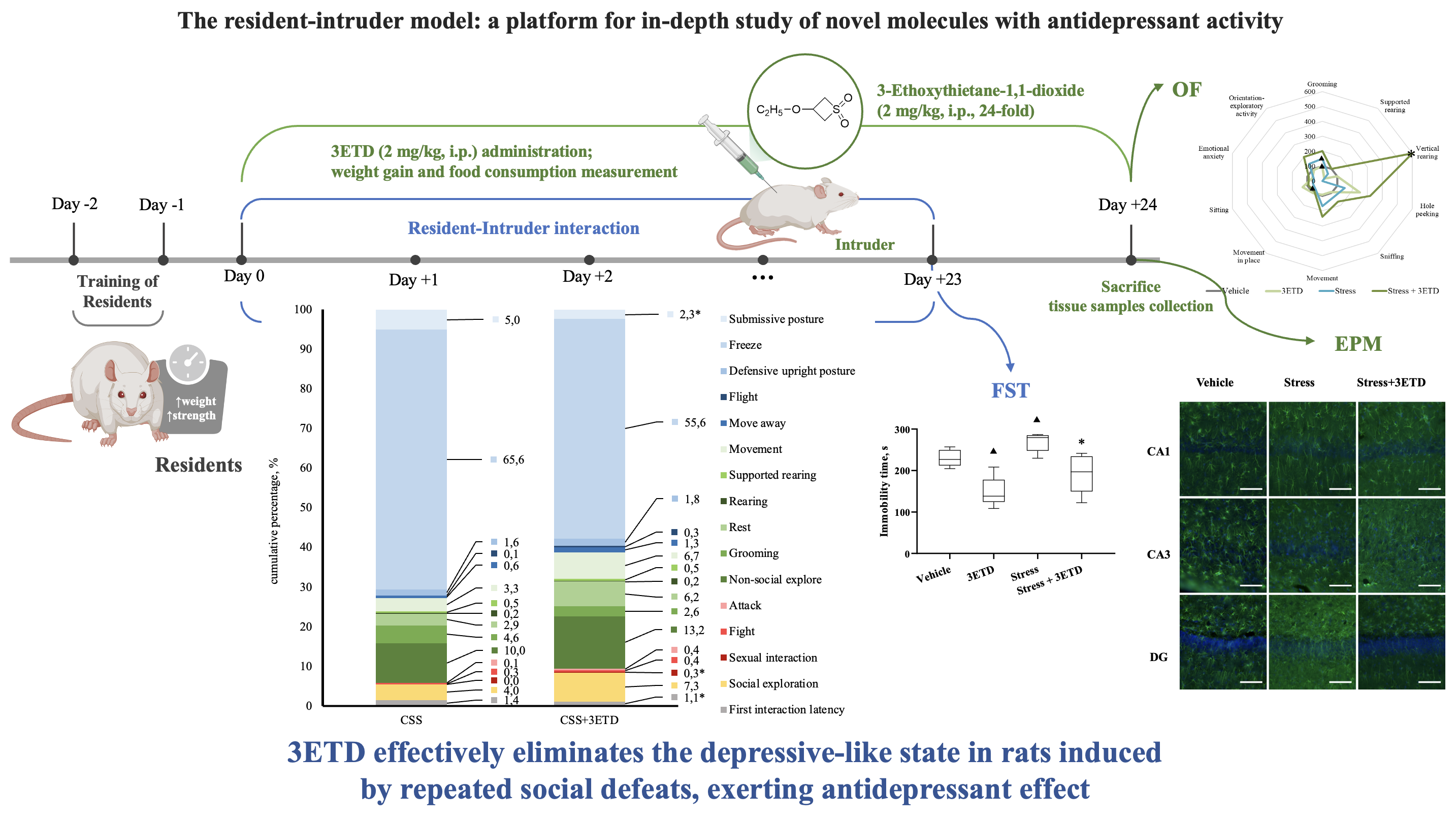 Introduction: The aim of the study was to investigate the features of the resident-intruder paradigm as a basic translational method for in-depth evaluation of antidepressant activity of new compounds using the example of 3-ethoxythietane-1,1-dioxide (3ETD), which has antidepressant activity.