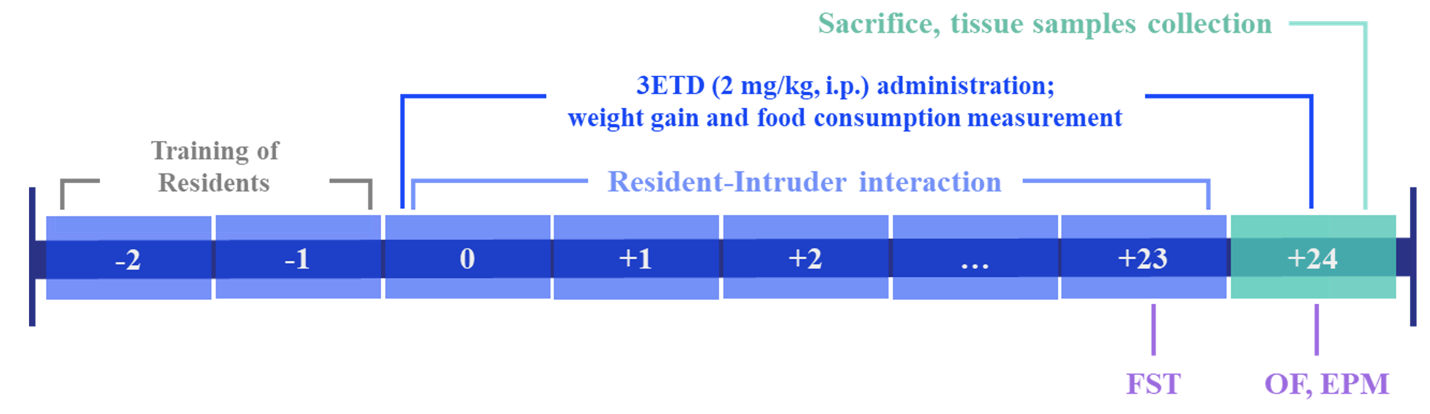 Conclusion: The resident-intruder model allows modeling in rats a condition similar to the human asthenic depression and demonstrating the antidepressant effect of novel molecules, as was shown on the 3ETD example when administered at a dose of 2 mg/kg/day intraperitoneally.